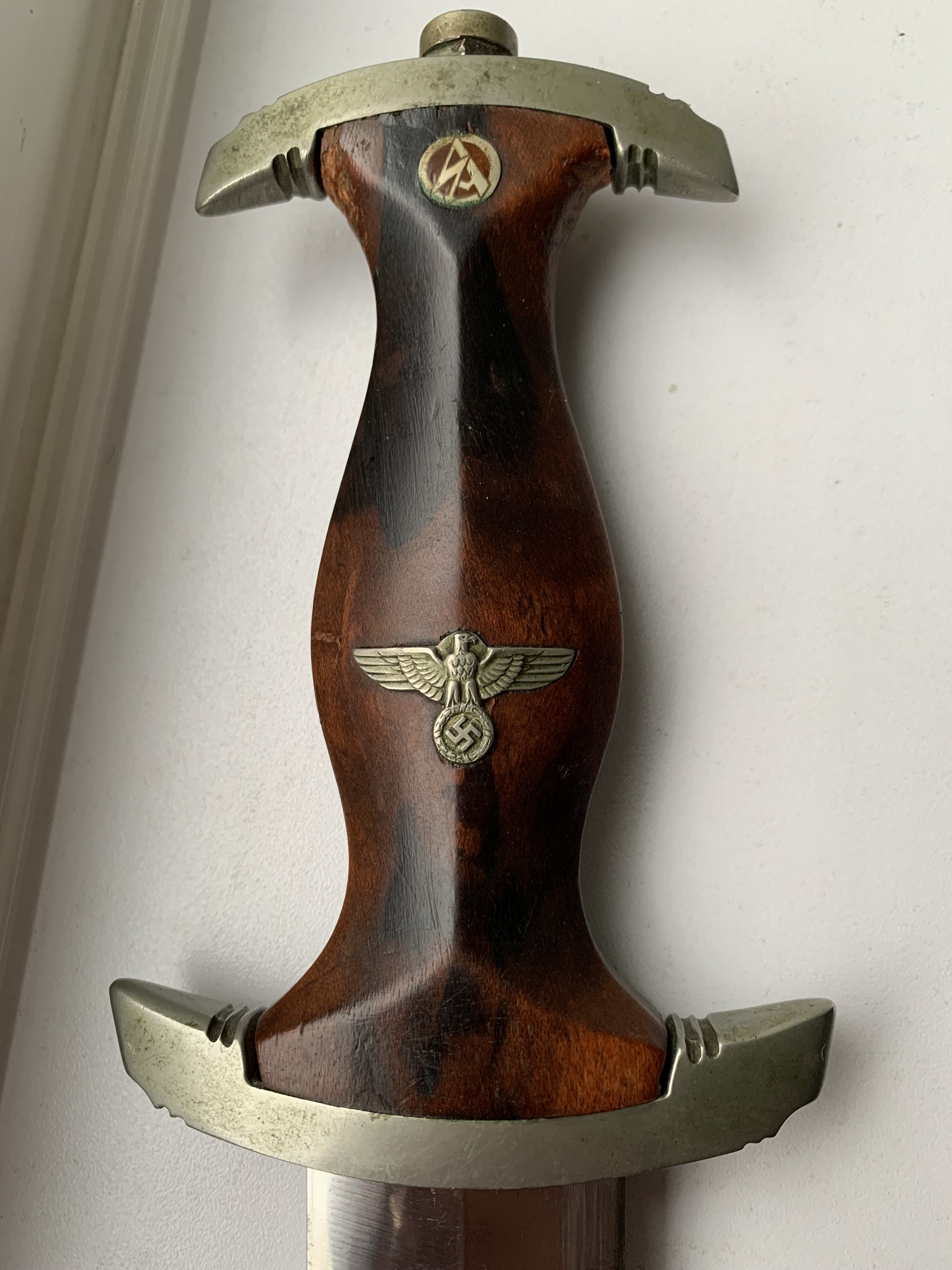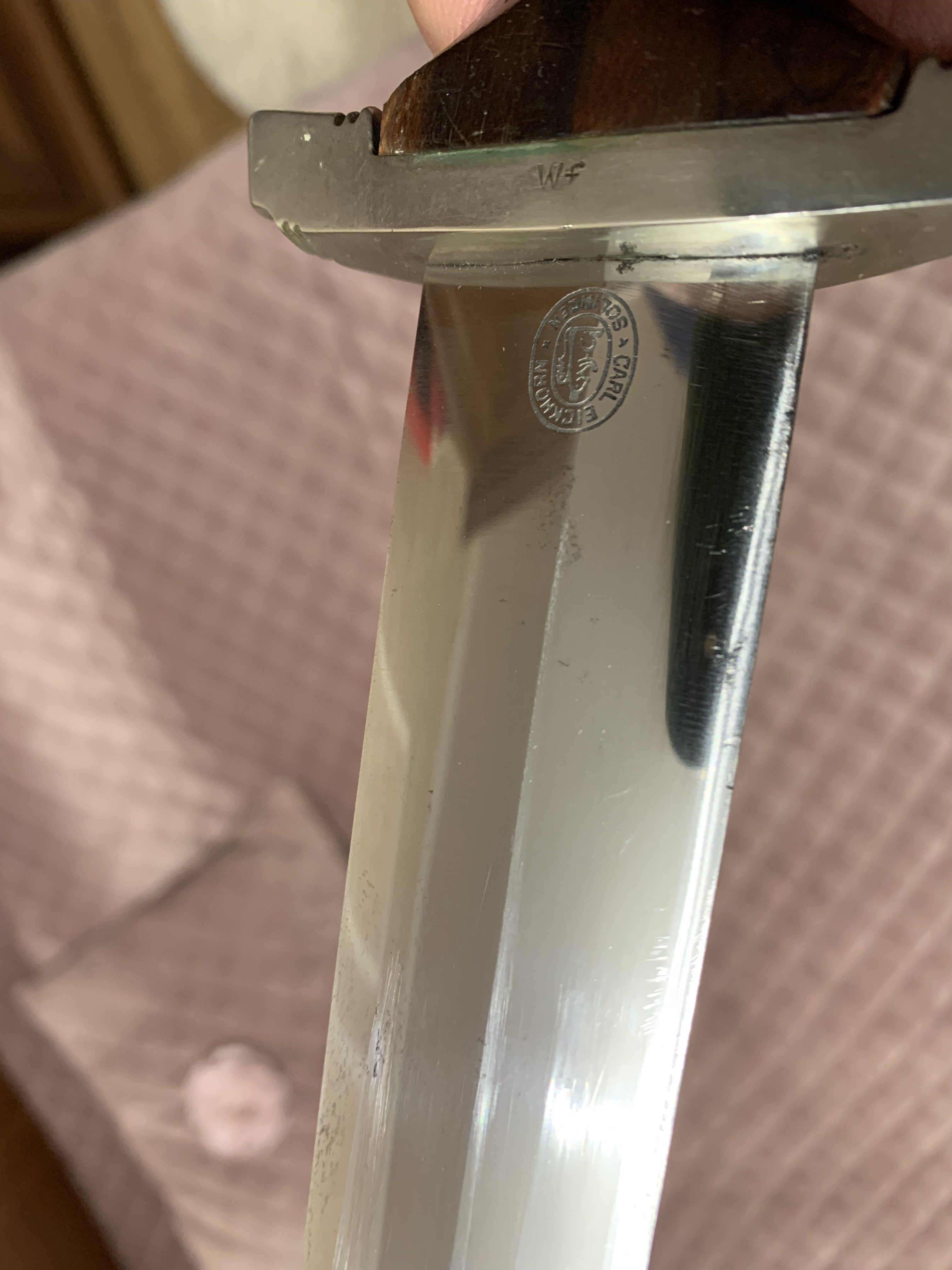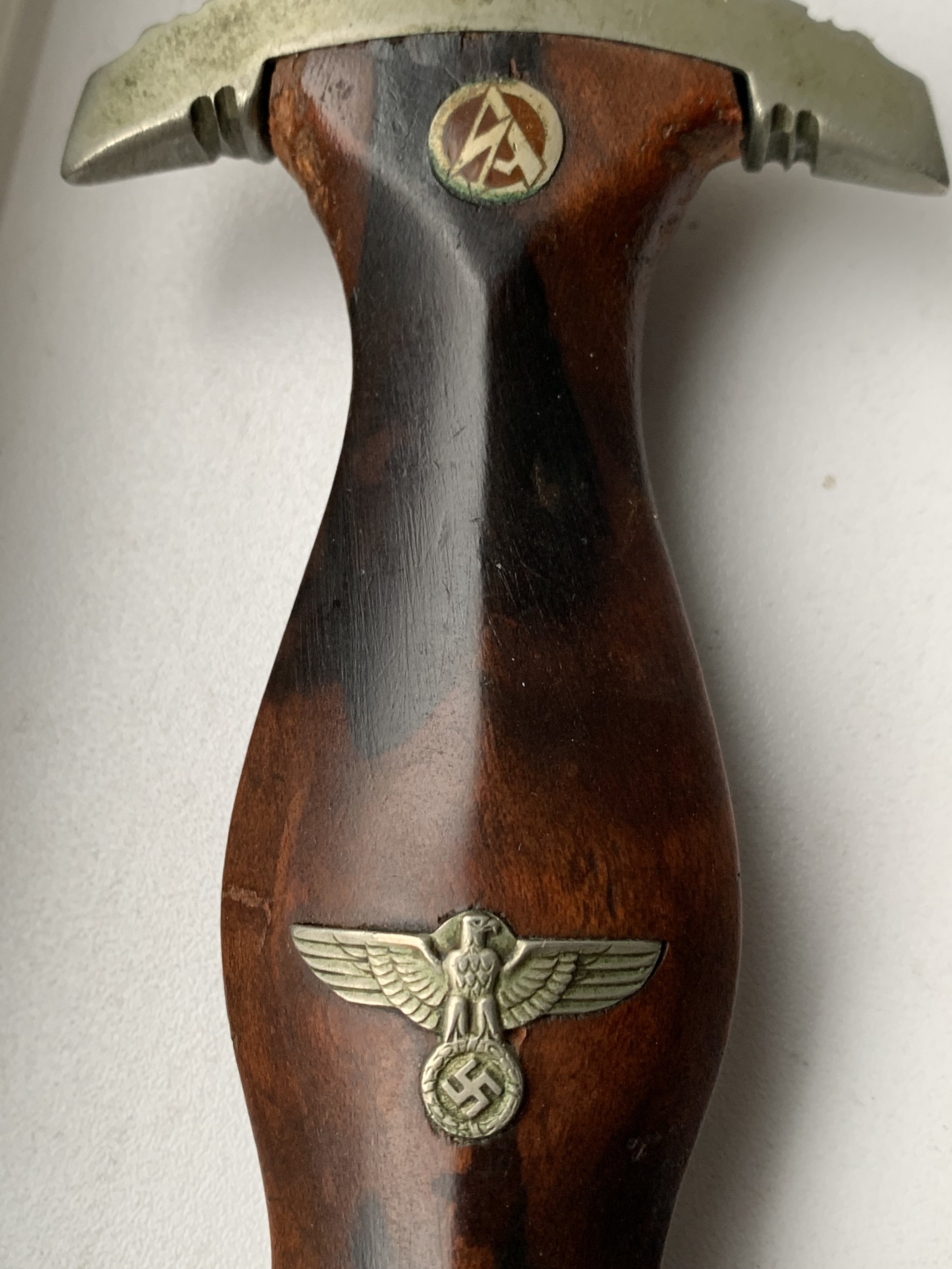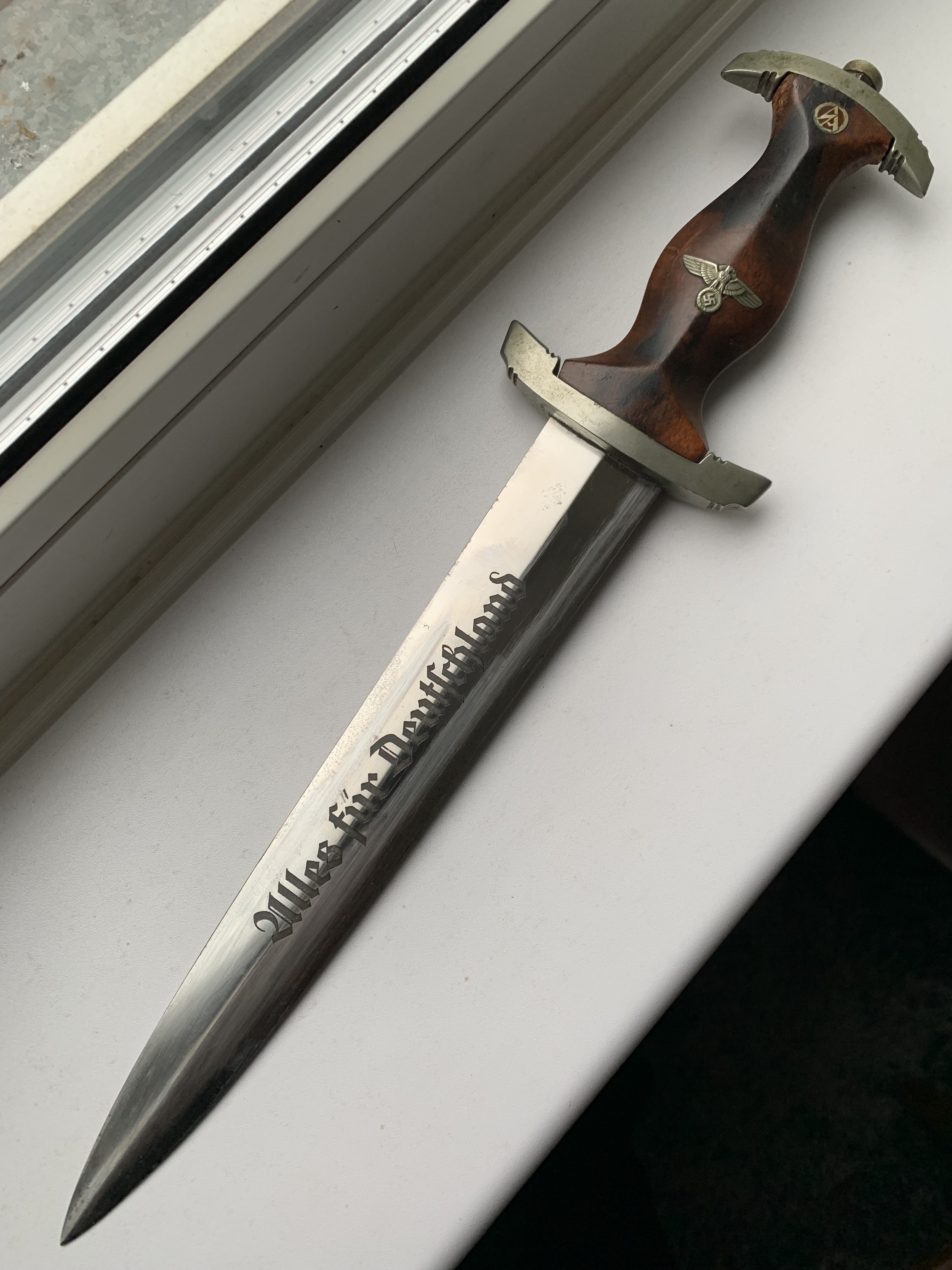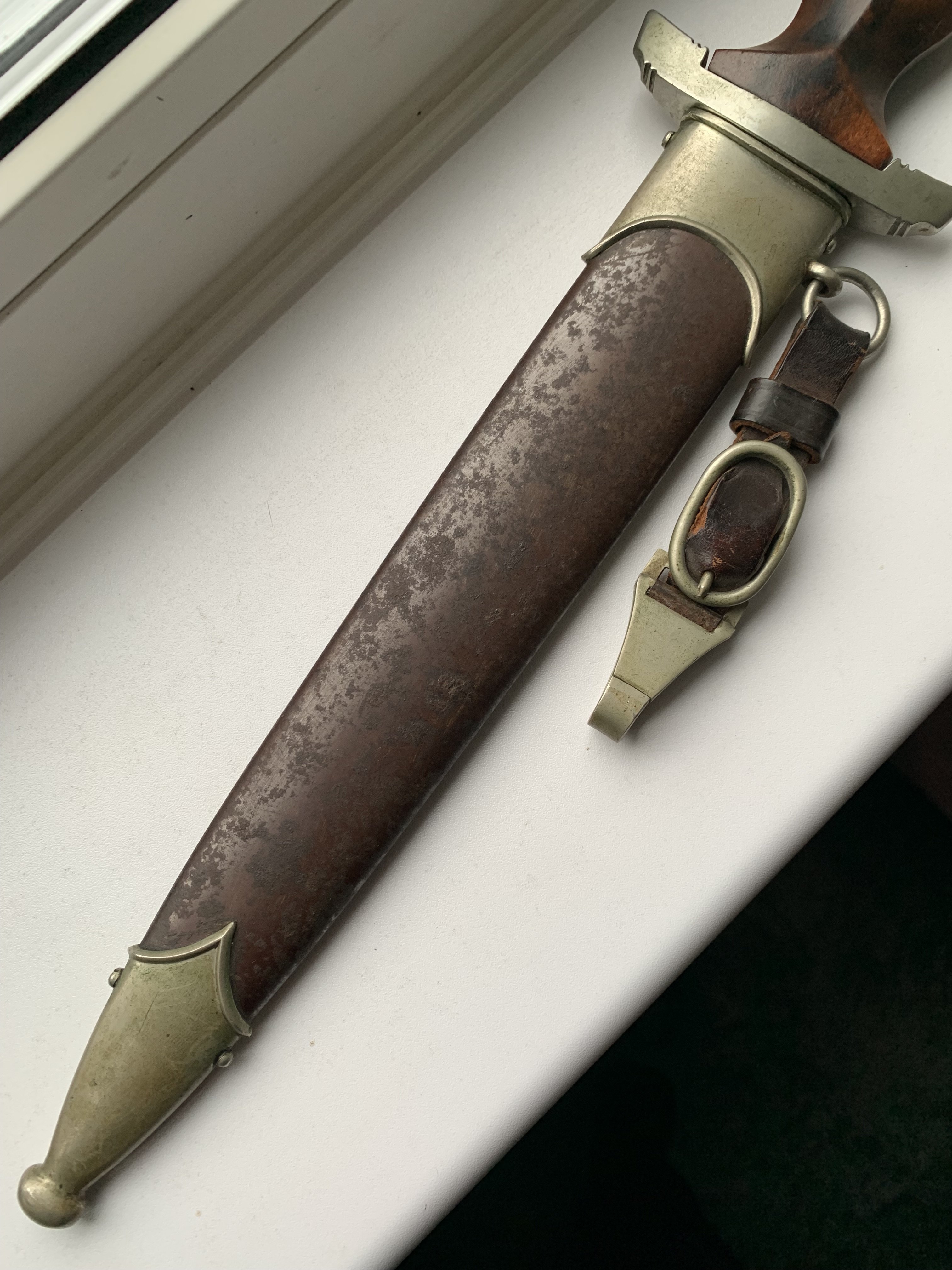 Вітаю. У вас оригінальний кинджал. З приємною патиною, що рідко можна зараз побачити. Знак района ГАУ Wf (Westfalen) відповідає цьому виробнику. Порада Вам: ніколи не потрібно розбирати кинджали. З товщиною леза у Вашого кинджала все нормально. Фото для прикладу, правда другого виробника.