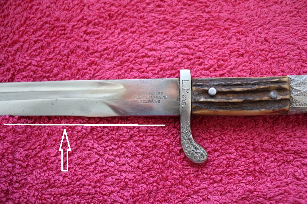То, что принимается за "канавку" после перешлифовки из сабельного клинка. на самом деле является долом на клинке штыка. Всё дело в том, что штык скорей всего пытались точить какие то "аборигены". На это указывают изуродованные спуски клинка, особенно наглядно это проявляется в зоне пяты клинка, кстати тут же очень хорошо видно, что и геометрия "режущей" кромки убита, виден провал как на замученном точилками кухонном ноже. Думаю, что за 30 лет собирания опыта вам известно, что штыки не точили как ножики, тем более служебный, не боевой. По поводу дырок на вашей щёчки ведь сразу понятно, что она была установлена на Веймарском штыке, с последующей адаптацией к под укороченный образец 3Р. Отверстия появились после замены эмблемы.