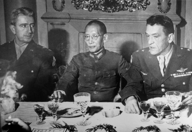 Начальник штаба главного союзного командующего на театре военных действий в Юго-Восточной Азии американский генерал-майор Альберт Ведемейер (Albert Coady Wedemeyer, 1897—1989, слева) и командующий 14-ой воздушной армией США генерал-майор Клэр Ли Шеннолт (Claire Lee Chennault, 1893—1958, справа) сидят за столом вместе с губернатором китайской провинции Юньнань генералом Лон Юнем (1884—1962) в его резиденции. Войска под командованием Лон Юня контролировали единственную дорогу, соединявшую Китай и Бирму, а также опиумные плантации