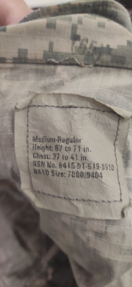 Кітель MR, на зріст 170-180, обхват грудей до 104. ACU UCP. Заміри по факту: рукав від горла по зовні 83 см, ширина під рукавами 59 см. Стан нормальний, без видимих дефектів, тканина NYCO, 50/50, ріп-стоп. Вартість 400 грн