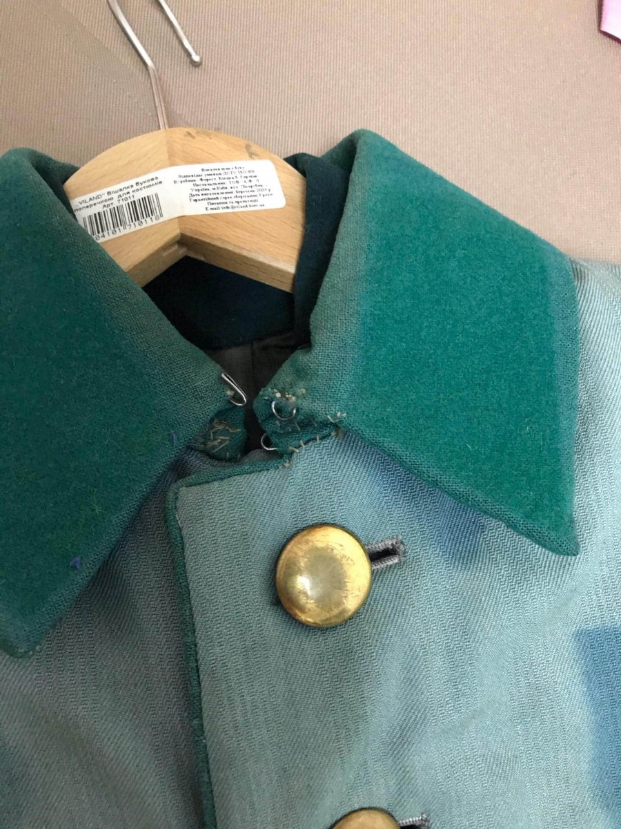 И сам крой кителя не немецкий. Вшиты подплечники, короткие пришивные обшлага с зеленым в цвет воротника кантом.