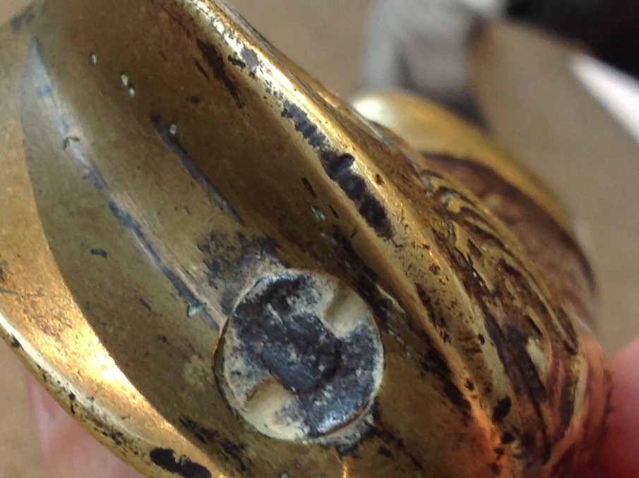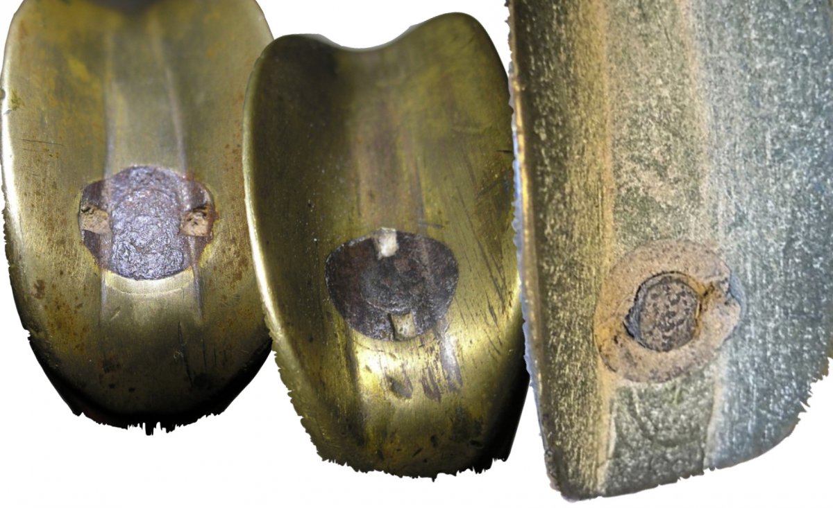 С шашкой все в порядке. Она не разбиралась. Просто пилотку не чистили. Это окислы. Разность латуни, это нормальное явление. Так как голова и устье паялись из одной латуни(они более темные) а втулка литье. В ней применялась другая латунь. И окислы у них разные При литье это нормально. Гайка на устье тоже литая, но чуть темнее гайки нижней. Это от соприкосновения с листовой латунью она получила более большую дозу окислов. Черен родной. Шашка безвопросная. Вот пример литья и листовой латуни, из которой паялись детали.