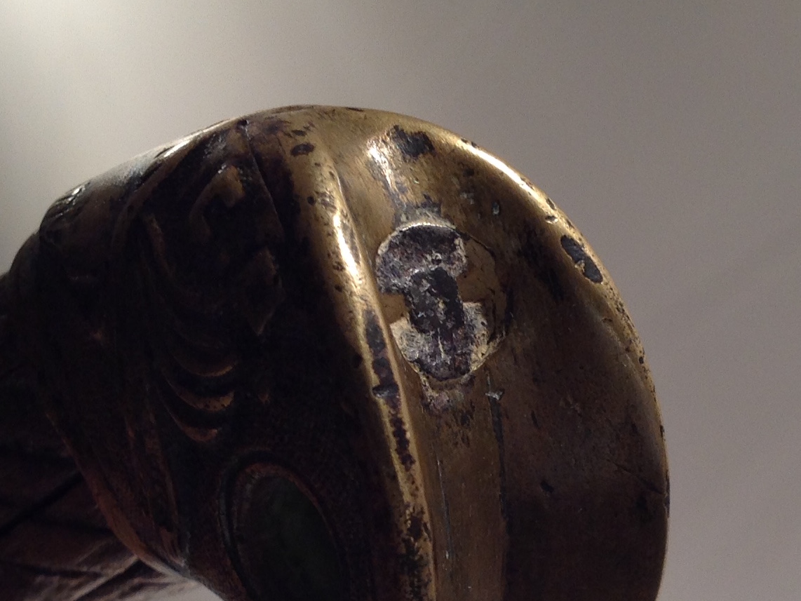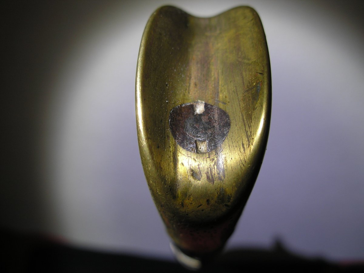 Олег латунные детали эфеса заметно отличаются по цвету. Черен выглядит новым по отношению ко всему предмету в целом. Гайка чем-то замазана, или это так отражено на фотографии...... Ребята которые в теме пусть повторно выскажутся, исходя из последних фото. Меня лично рукоять чем-то настораживает, только моё мнение. Не знаю правильно ли я поднимаю тему?! В первом посте и в самой теме, ты спрашивал только о клейме. В приложении фото гайки на моём предмете. С ув.......