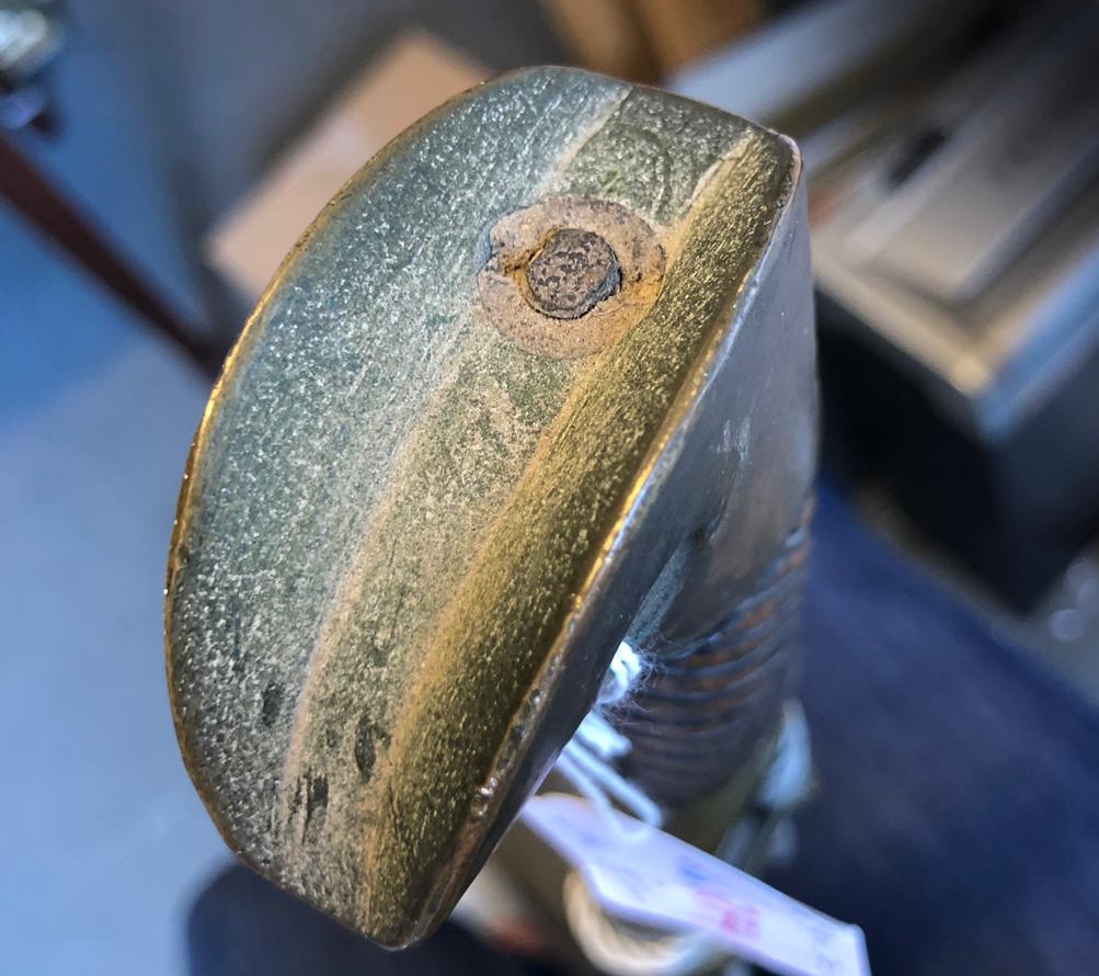 Судя по общему виду гайки, такое впечатление, что головка рукояти вместе с вкипевшей в латунь гайкой имеет незначительный люфт на самой резьбе хвостовика клина, так как в районе последней пары витков, отсутствуют характерные признаки столетнего соединения, обычно такое явление наблюдается при подвижном резьбовом соединении. По предмету (как уже сказано) видно, что всё по родне, замечательный, не частый предмет, но гайка имеет не привычный обычому вид.