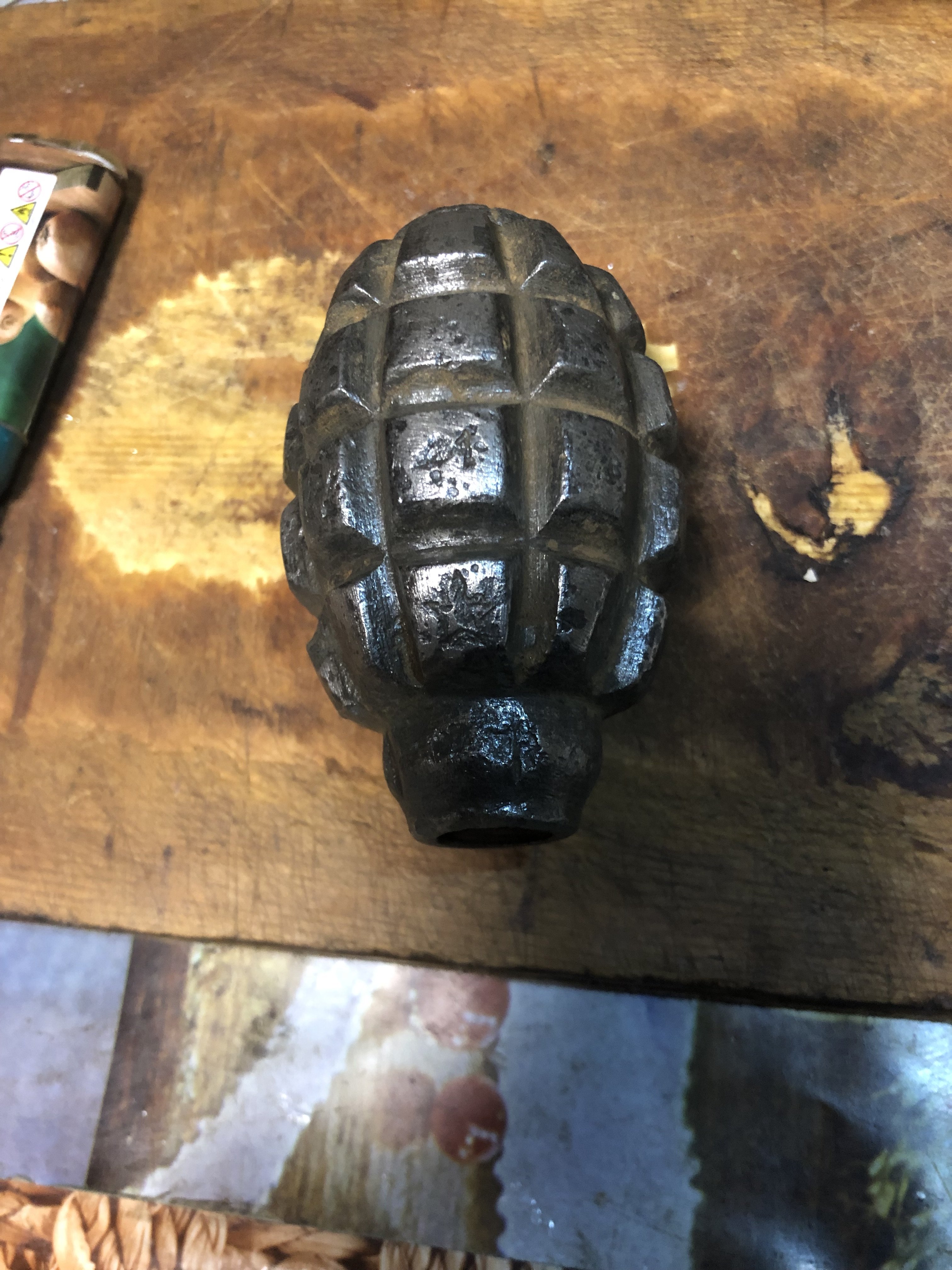 Добрый день. Клеймо похоже на клеймо завода #48 НКБ. С 1941 года выпускал корпуса для снарядов катюш и корпуса ручных гранат. 4 это номер партии.
