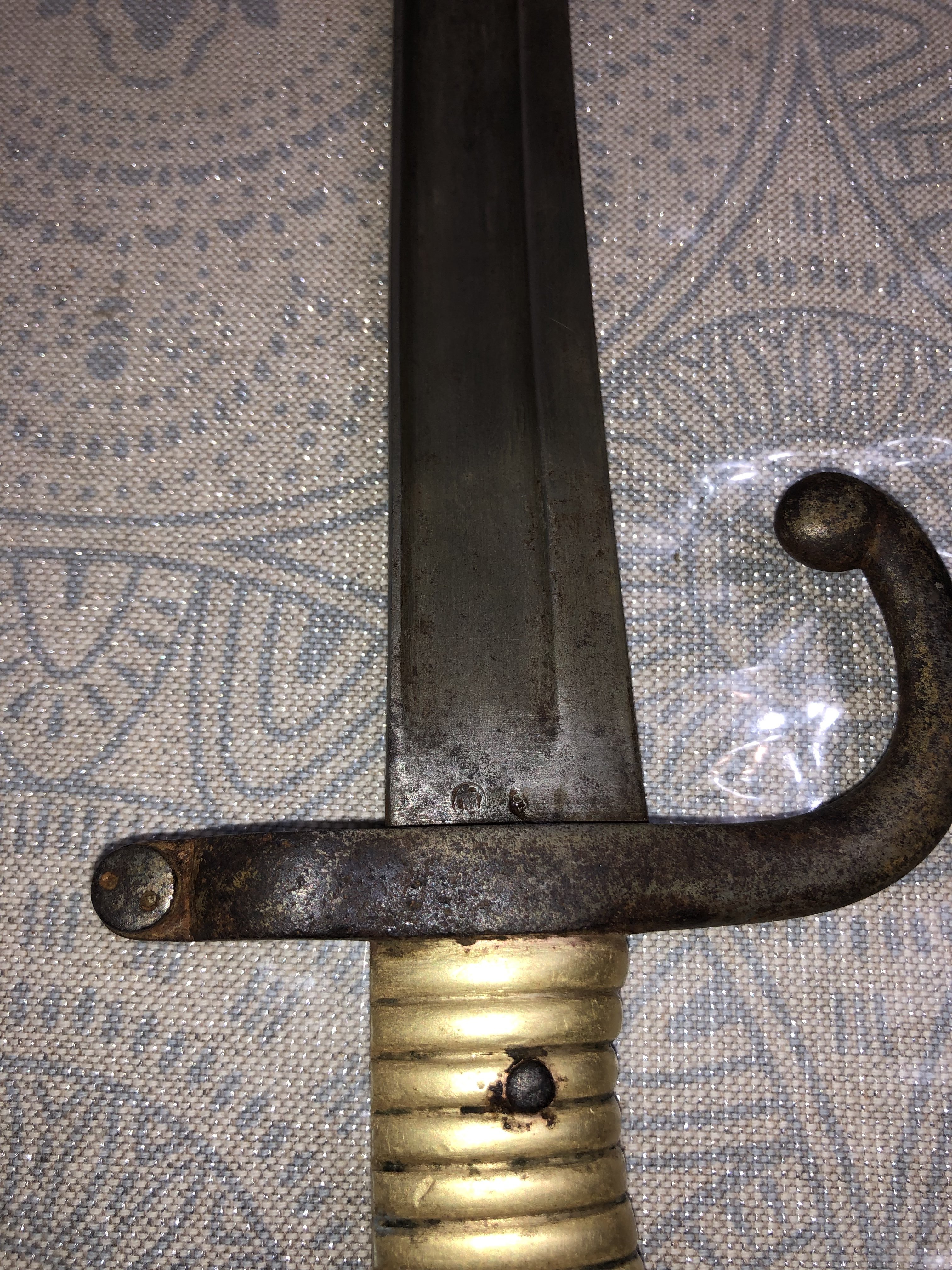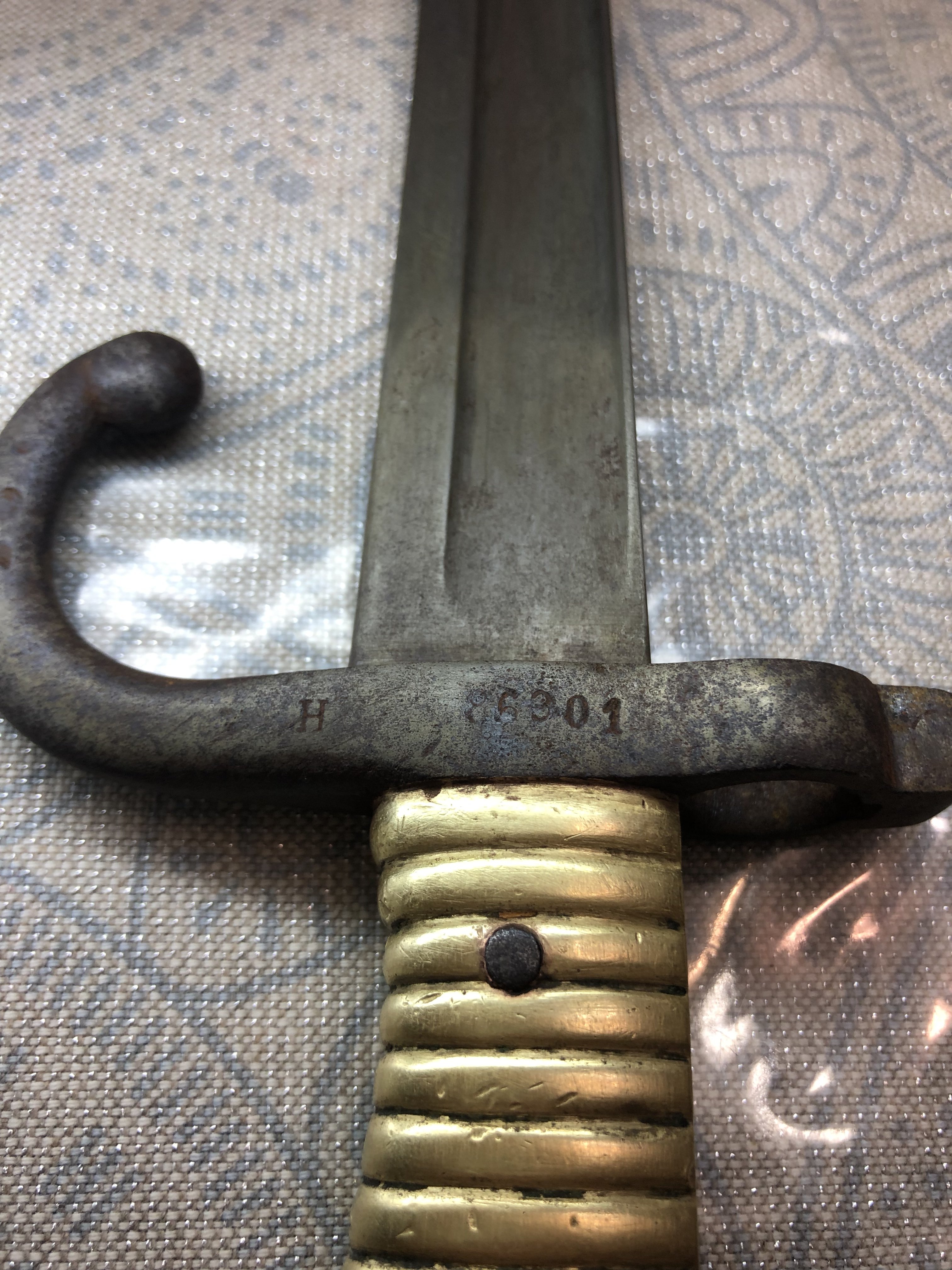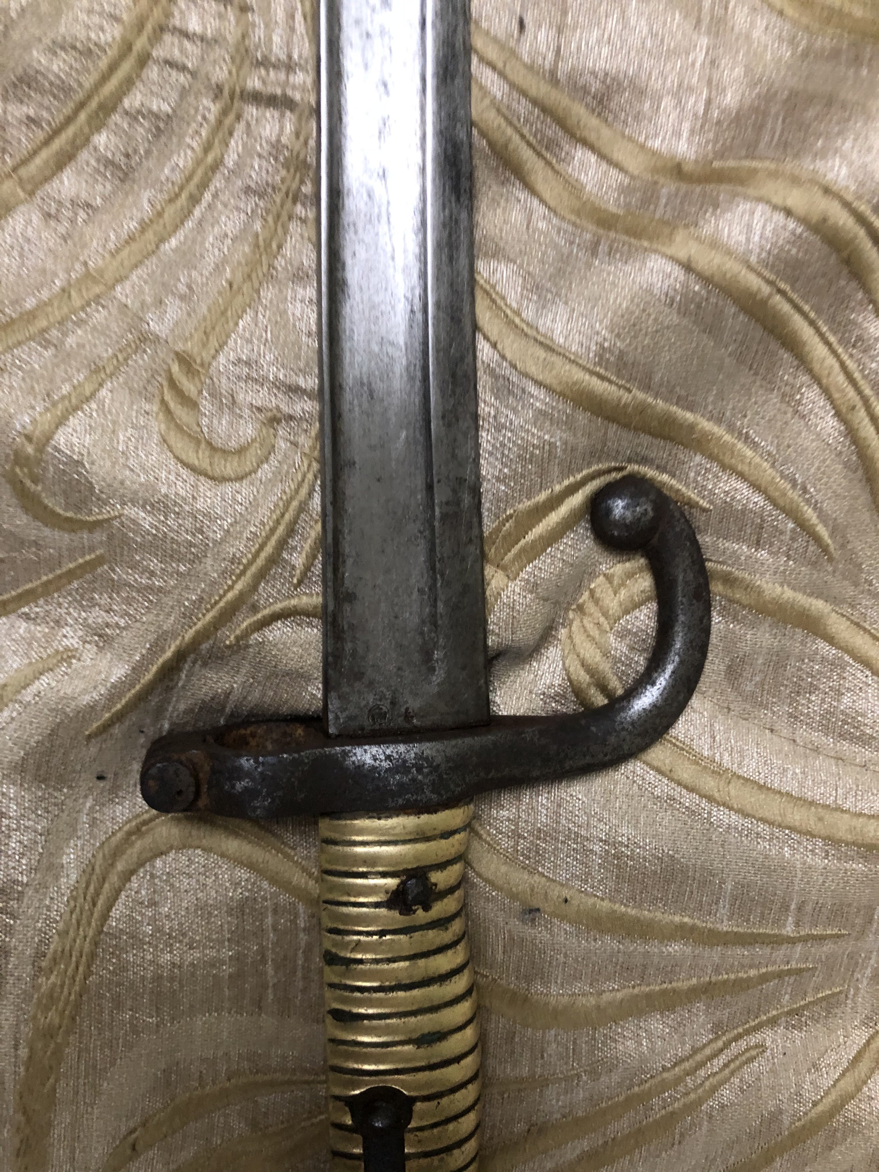 Правильно называть-штык обр. 1866г. к винтовке системы Шасспо. Без ножен,но и без особых изьянов, оценил бы его в 5000-5500гр.