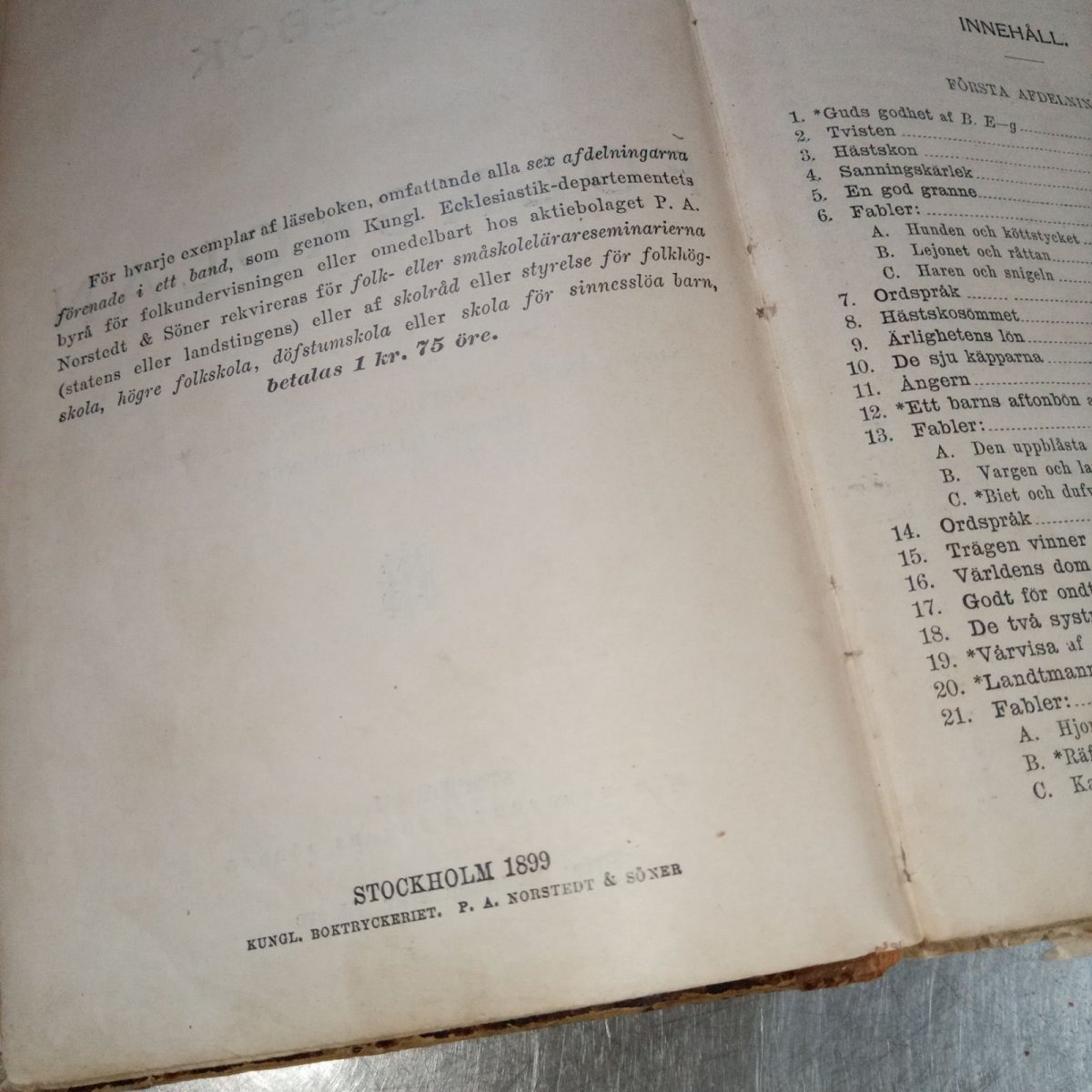 Вітаю Дуже цікава книга, заставили трохи поритися в мережах. Книга для читання - це ніби дослівний переклад. Насправді це книга яка використовувалась в школах Швеції з середини 19ст. Ця книга була створена, як перший підручник для навчання і який не був створений церковниками. Ця книга поєднувала в собі різні дисципліни: літературу, мистецтво, етику, історію, природознавство і тд. Загалом здається 7 чи 8 розділів. До цієї книги не входила тільки математика. Цей підручник постійно змінювали і дописували - відповідно книга ставала товстіша. Ваш підручник - це 9 видання і це останнє видання коли всі предмети були в одній книзі, потім його розділили. Ще особливістю 9-го видання (тобто цієї книги) є те, що воно містить ілюстрації. Попередні видання їх не містили або ілюстрацій було зовсім мало. Ще ця книга є цікава тим, що в ній великий акцент робився на морально етичні цінності і духовний розвиток особистості. Вона містить різні вірші, притчі і т.д. Тобто, якщо її почитати, думаю можна багато цікавого дізнатись про те як мислили люди того часу. Це мабуть цікаво для філологів або тих хто вивчає культуру. Ілюстрації гарні, я знайшов кілька сторінок в неті - Наполеон сподобався. Якщо говорити про грошову цінність, я не впевнений що це хтось дійсно захоче купити. Основна проблема - це шведська мова. Носіїв цієї мови дуже мало, хоч вона і схожа на англійську та німецьку. Основний плюс книги, як на мене - ілюстрації. Можливо вони когось зацікавлять, наприклад, мені подобаються ілюстрації того періоду, і я би потратив якусь сотню на придбання . А загалом, на цьому форумі навряд хтось дасть оцінку (я маю на увазі не тільки грошову), трохи тематика не та. Маю надію, що трохи нової інформації підкинув