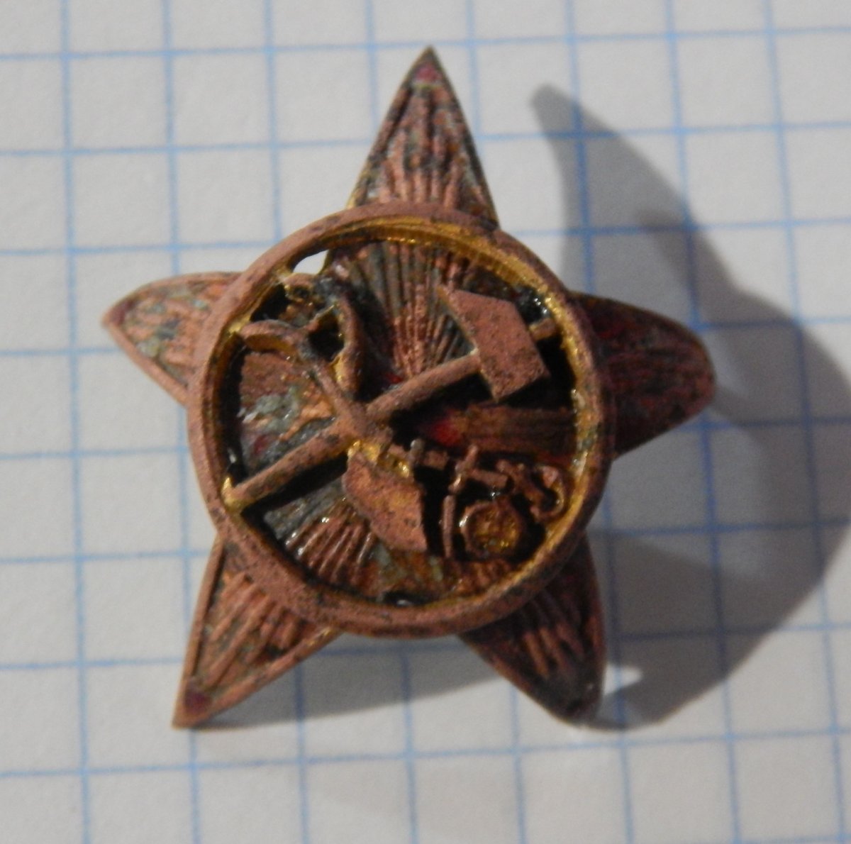 Здравствуйте . Одна из разновидностей кокард 1918-1922. Такая была Был еще нагрудный знак с такой звездой , но на Вашей лучи без пайки .