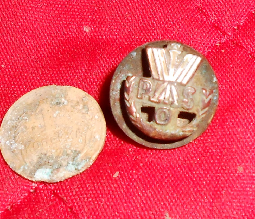 Доброго здоровья всем! Сегодня по 41-му была найдена жестяная коробочка со швейными принадлежностями (предположительно польского военного). Состав: 2 пуги с орлом (кительные), 3 пластмассовые пуги, медальон на цепочке, скруток ткани, перевязанный ниткой и кокарда. На фото. Самому идентифицировать не удалось - прошу помощи. Рядом для масштаба 1 коп СССР.