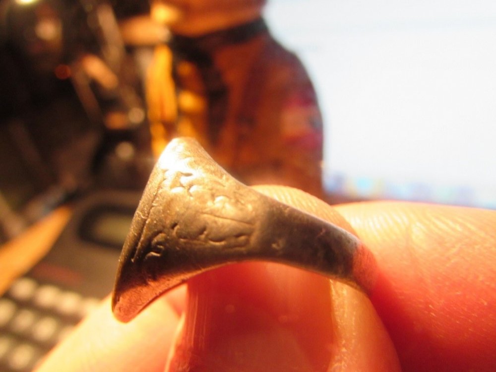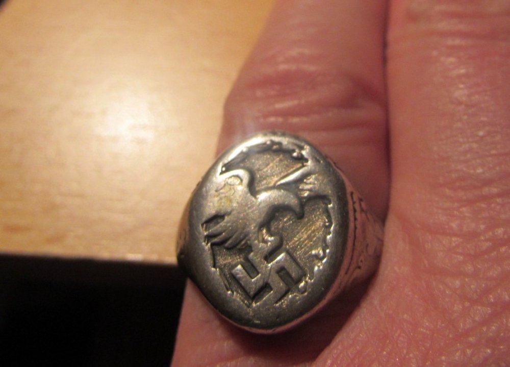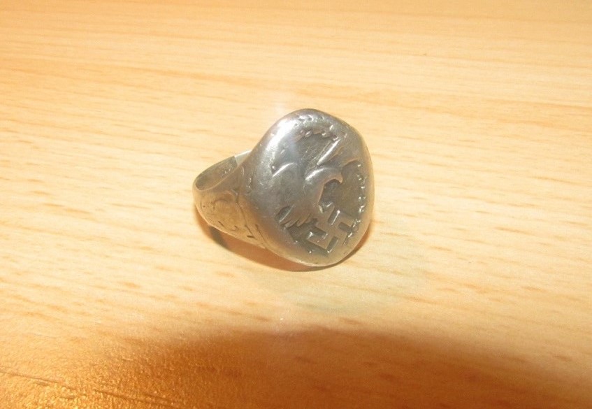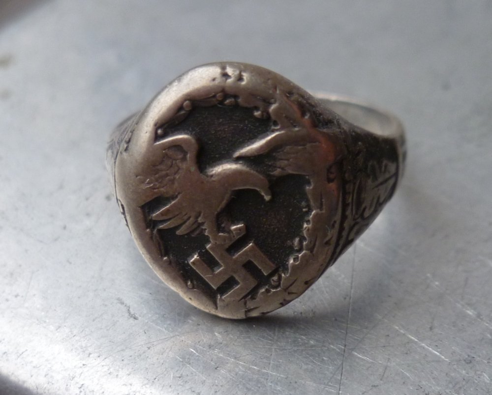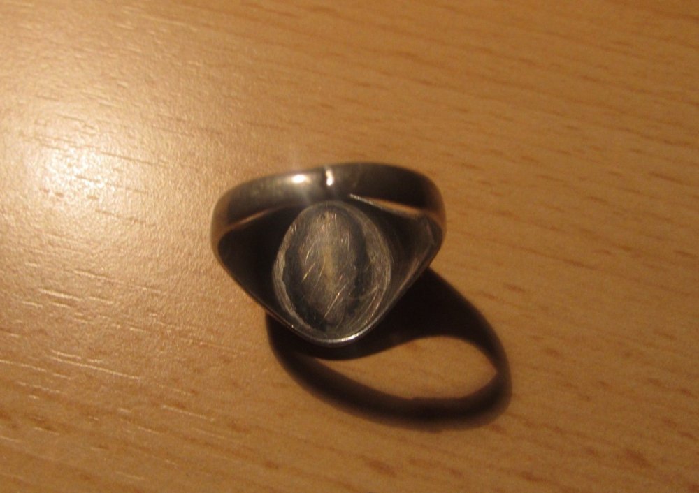 Оригинальное кольцо , сильно ношено. Серебро. Клеймо : 835 и буквы : E R (посл. буква под ?). Лопнуло в самом слабом месте - был изнутри ремонт пластинкой , сейчас опять немного эта пластинка отошла с одной стороны. На листьях и внутри орла - просматривается еще настоящая позолота. Прошу коллег высказаться.