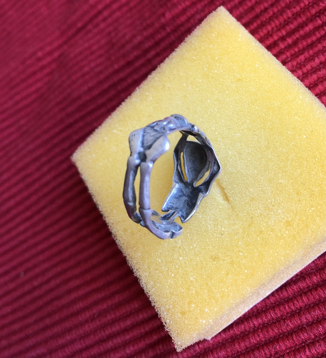 Нечастое кольцо 19-го века, могли и позже носить, мода на черепа была и в ВМВ. Можете погуглить memento mori ring, как раз песочные часы в ногах скелета и символизируют бренность всего сущего.