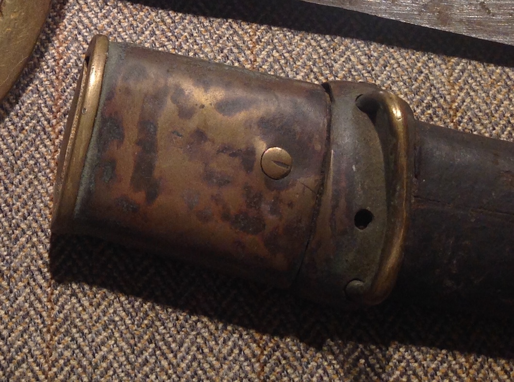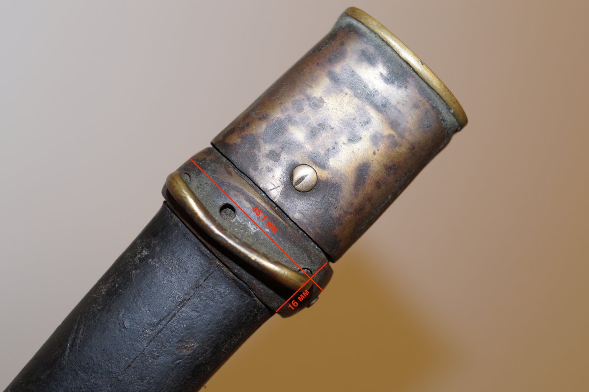 Видиться верхняя гайка от ножен Шашки артиллерийской солдатской обр. 1868 г. Это укороченный вариант Сабли Драгунской солдатской обр. 1841 г. Единственное вы вводите сообщество в заблуждение, потому что даже по Вашим фотографиям отчётливо видно что длинна гайки состовляет примерно 46 мм - 48 мм. Если есть возможность сделайте замеры штангенциркулем и убедитесь сами. С уважением.......