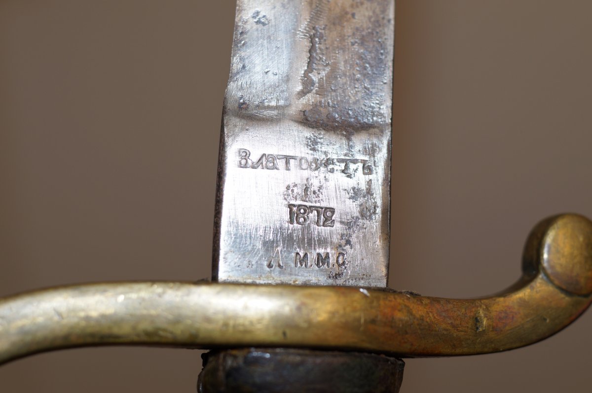 Владимир день добрый. Пока я сделал фото, Дима уже всё написал (даже год выпуска)!!! Действительно в обоих случаях с обратной стороны на пяте клинка имеется клеймо: ЗЛАТОУСТЪ 1872 А М.М.С С ув.......
