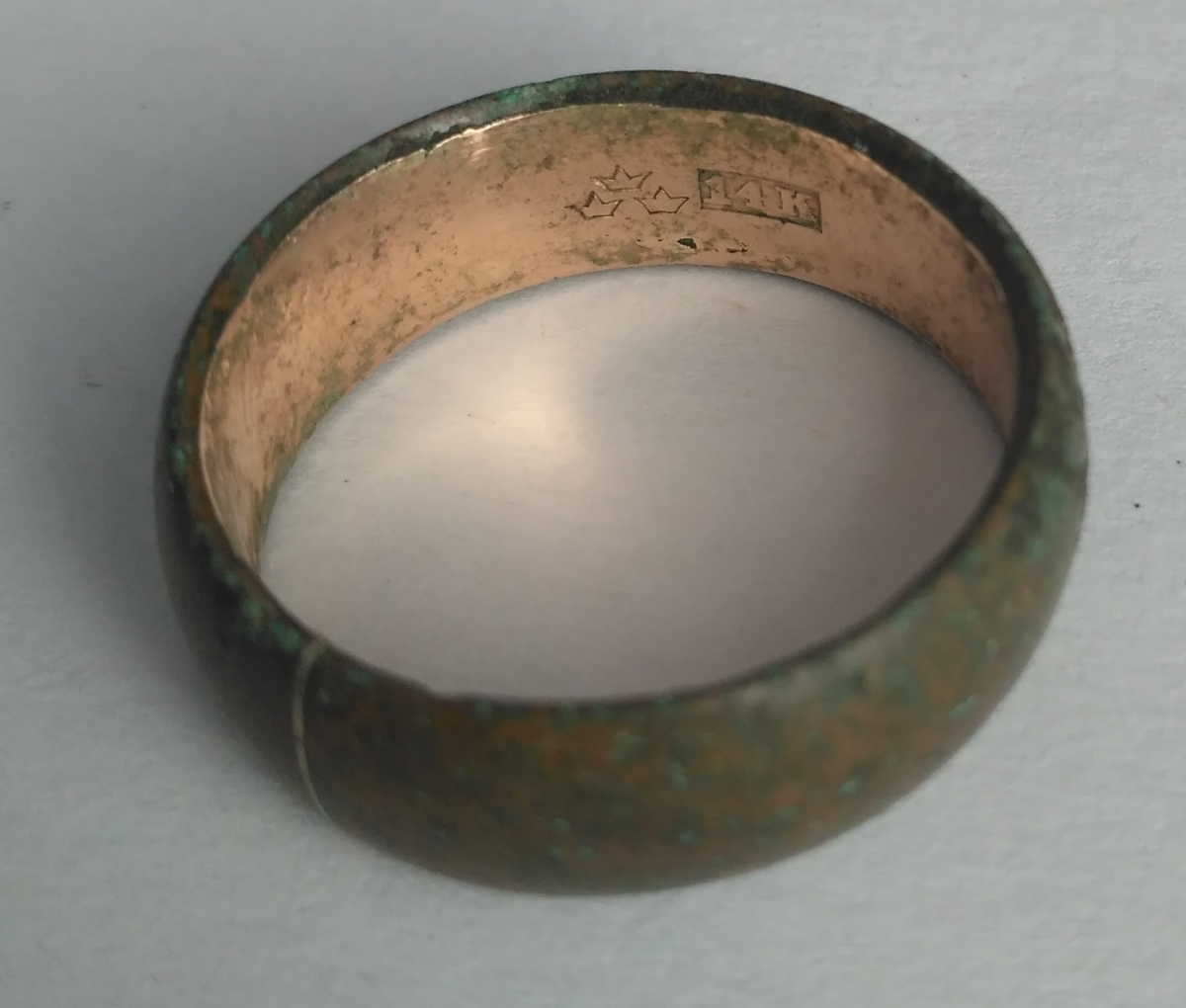 Если позеленело то скорее всего позолота (находил подобное) помогла эта ссылка http://kamertab.com/article/pozolota-14k-18k-a-vy-znaete-chto-eto-znachit/ но лучше сделать запил и капнуть азоткой (если позеленеет сплав) или к ювелиру.