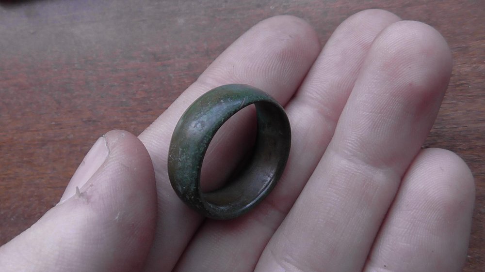 Подозреваю, простая медная обручалка на 18-19 век, ну на всякий случай переспрошу. Патина толстая, прямо как покрашена краской.