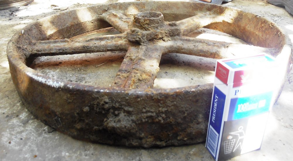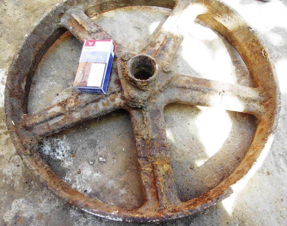 Скорее всего колесо с ременной передачи с молотилки или любого другого механизма - ширина как раз под ремень. Может с локомобиля.