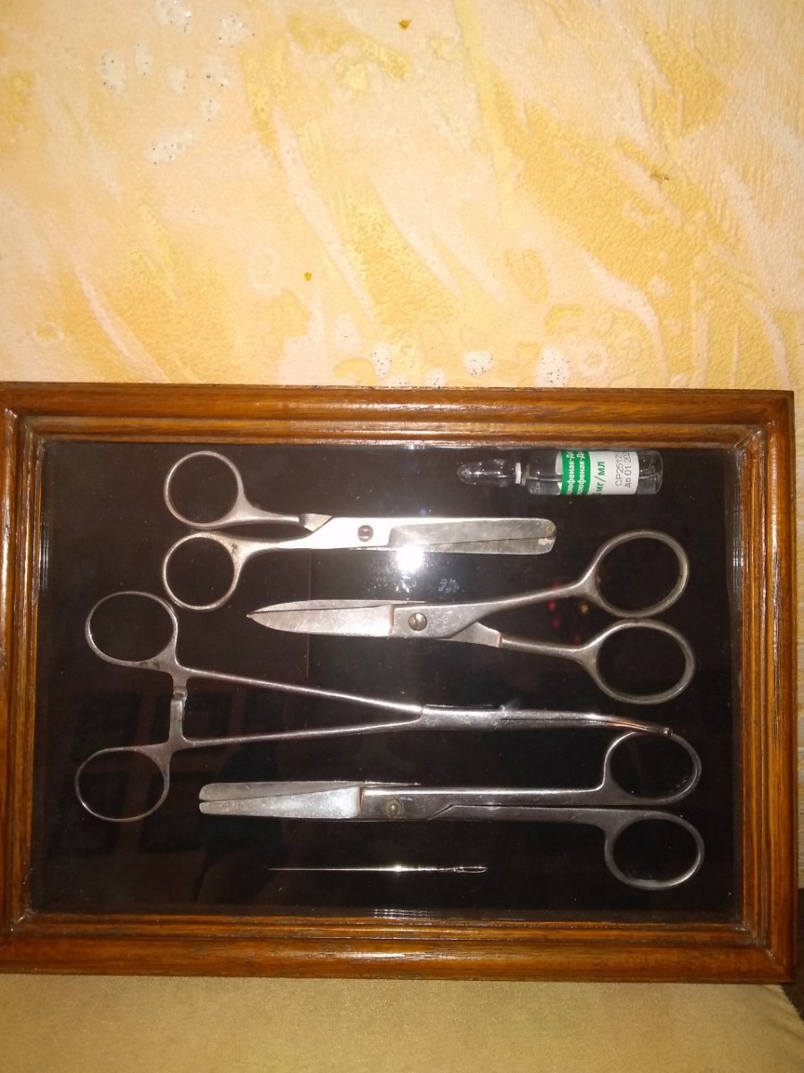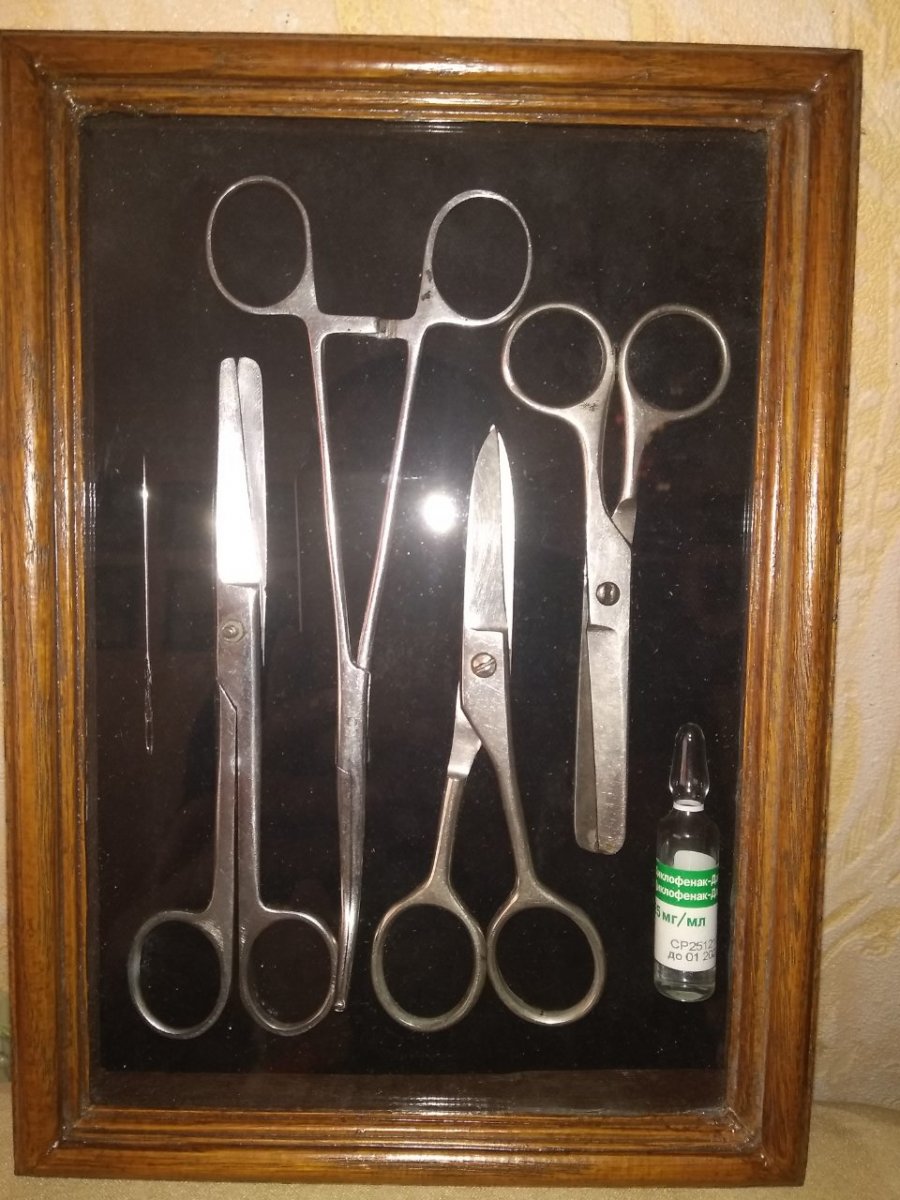 Продается небольшая коллекция советских медицинских хирургических ножниц в деревянной рамке ручной работы на черном бархате под стеклом.Рамка имеет два варианта подвеса вертикальный и горизонтальный.Данный коллаж подойдет для украшения мед.кабинетов,а также может быть хорошим подарком медицинским работникам,или коллекционерам.Коллаж имеет винтажный вид.Смотрится красиво.Цена 400 грв..
