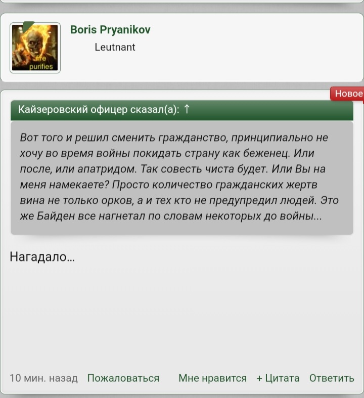 Вот того и решил сменить гражданство, принципиально не хочу во время войны покидать страну как беженец. Или после, или апатридом. Так совесть чиста будет. Или Вы на меня намекаете? Просто количество гражданских жертв вина не только орков, а и тех кто не предупредил людей. Это же Байден все нагнетал по словам некоторых до войны...