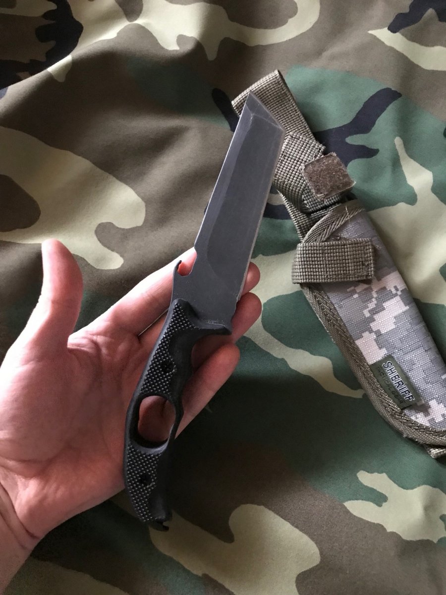 Покрытие: горячее химическое оксидирование(оружейное воронение). Сталь: 60С2А - черная пружинная рессорная сталь. Накладки: Маслостойкая резина. Толщина – 5 мм. Производитель: Колодач Страна производитель: Украина Твердость режущего лезвия: 56.58 (HRC) Длина рукоятки: 12.5 (см) Длина ножа: 24.5 (см) Вес ножа: 210.0 (г) Цвет: Черный Заточка лезвия: Двусторонняя Материал ножен: Кордура Есть легкие следы использования Очень и очень странная штука, скорее всего для любителей какой-то "экзотики". Цена: на Стальной грани была 1200грн. сейчас цена на продажу 500грн