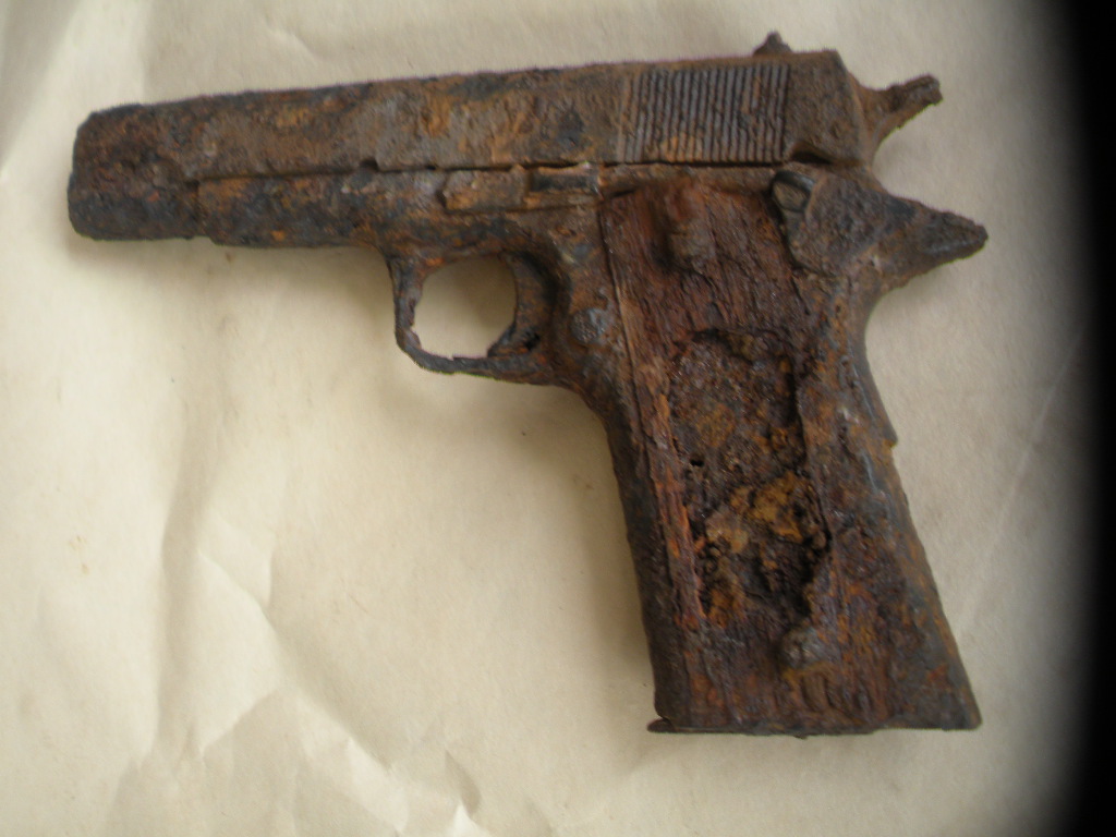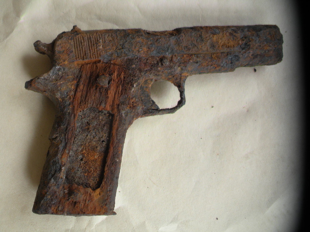 Праямая задняя часть рукоятки, нет выборки у спускового крюка, остальное трудно читаемо, косвенный признак деревянные накладки. Тут представлен м1911.