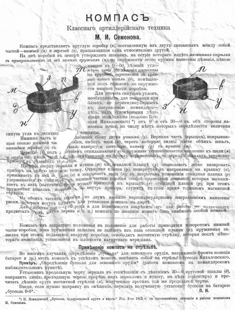 Это вторая модель (первая была сугубо наручной) этого конструктора, и скорее буссоль, нежели компас. Он мог комплектоваться специальным кронштейном для укрепления на подручных предметах. Широкого распространения не получил. В меру редкий. https://reibert.info/lots/kompas-klassnago-artillerijskago-texnika-m-i-semenova.267708/