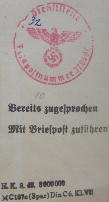 Тем более, что сам номер фельдпочты не простой, обычно на фуфло такие и выбирают, чтобы дороже продать - сначала парашютисты использовали, а потом СС-маны из 15 дивизии - 1.9.1939-1.1.1940 10. Kompanie Fallschirmjдger-Regiment 1. 1.3.1942-7.9.1942 nicht verwendet, wurde Fp.Nr. 39549 C. 12.3.1943-7.9.1943 Stab I und 1.-4. Kompanie SS-Freiwilligen-Regiment 2 Lett. SS-Freiwilligen-Legion, 3.3.1944 Stab I und 1.-4. Kompanie Freiwilligen-Grenadier-Regiment 33 15. SS-Division; 9.6.1944 Stab I und 1.-4. Kompanie Grenadier-Regiment 33 15. SS-Division; 8.9.1944 Stab I und 1.-4. Kompanie Waffen-Grenadier-Regiment 33 15. SS-Division;
