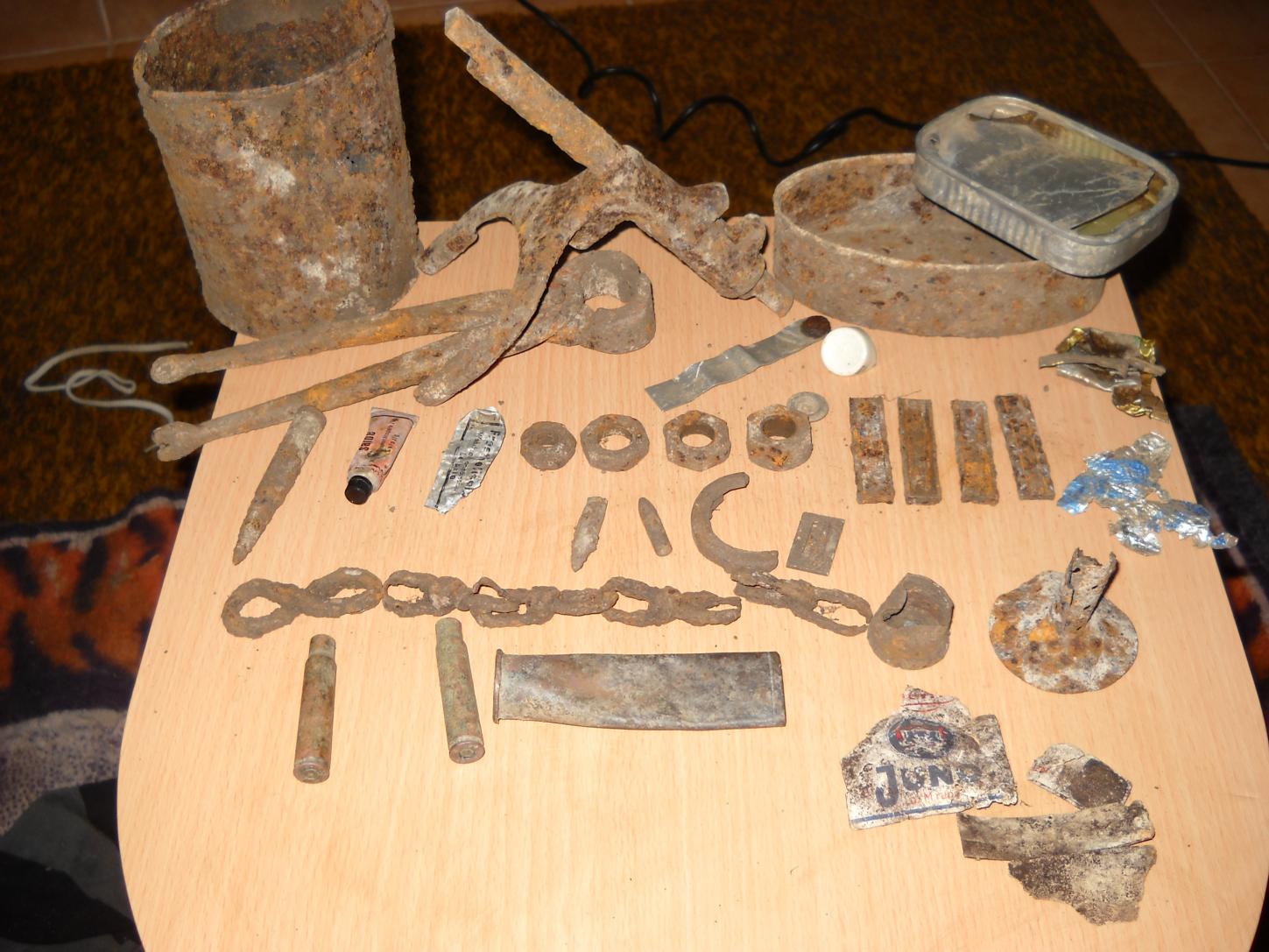 по фото-4 маузеровские обоймы,железные,если не ломаются тремя пальцами можно пробовать кислотить.ну,или так оставить,для антуража.клещи тоже можно покислотить,вдруг вылезут чекухи.алюминиевую консерву,косметику и сплющенную гильзу от ракетницы можно оставить(пока не найдёте целую),тем более латунь-чаще попадаются алюминиевые.остальное наверное можно...того..в расход... с уважением,thomas