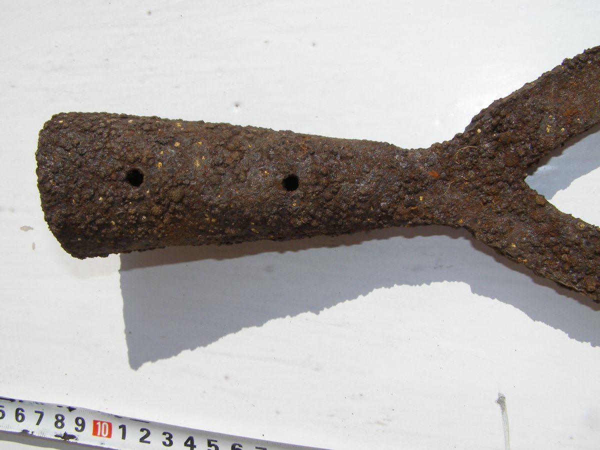 Мене теж дивує, чому є зварка та ковка в одному девайсі. Приварили б одразу лезо до рунки - із гарбузами боротися висточило би. Так доречі подібні прилади так і виглядають, без рогатки. Предмет піднятий неподалеку від Києва тому зі зваркою простіше було.