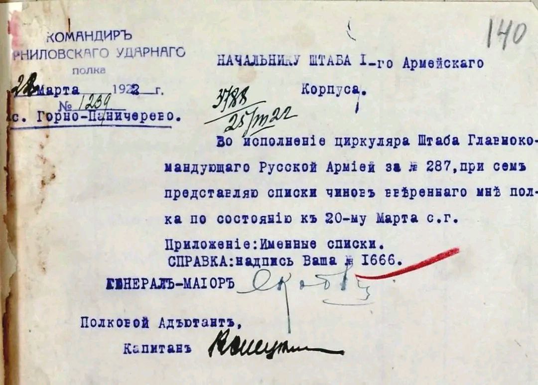 Донесение командира Корниловского ударного полка генерал-майора Н. В. Скоблина начальнику штаба 1-го Армейского корпуса. 22 марта 1922г.