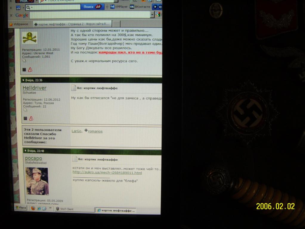Уважаемый Bubi, ничего против Вас лично не имею, и не сомневаюсь в оригинальности вашего кортика, а что люди предположили, появились вопросы по клюву, по клейму, я считаю что это нормально, для предмета "редкой модификации". По поводу покупки - не интересуют кортики совершенно, сам продавал недавно "сарайный сохран" некомплектного кригса, сам не в теме, поэтому каких либо предположений не высказывал, Если обидел Вас лично чем то - ИЗВИНИТЕ, но кидаться на людей без разбирательств тоже не вариант. Человек выставил предмет на обсуждение, скажите нормально что предмет Ваш и не в продаже, а уже потом разбираться кто "Пи..дабол" , а кто под раздачу попал, (к сожалению посты уже подчистили)... Надо быть добрее и люди к Вам потянуться С уважением!