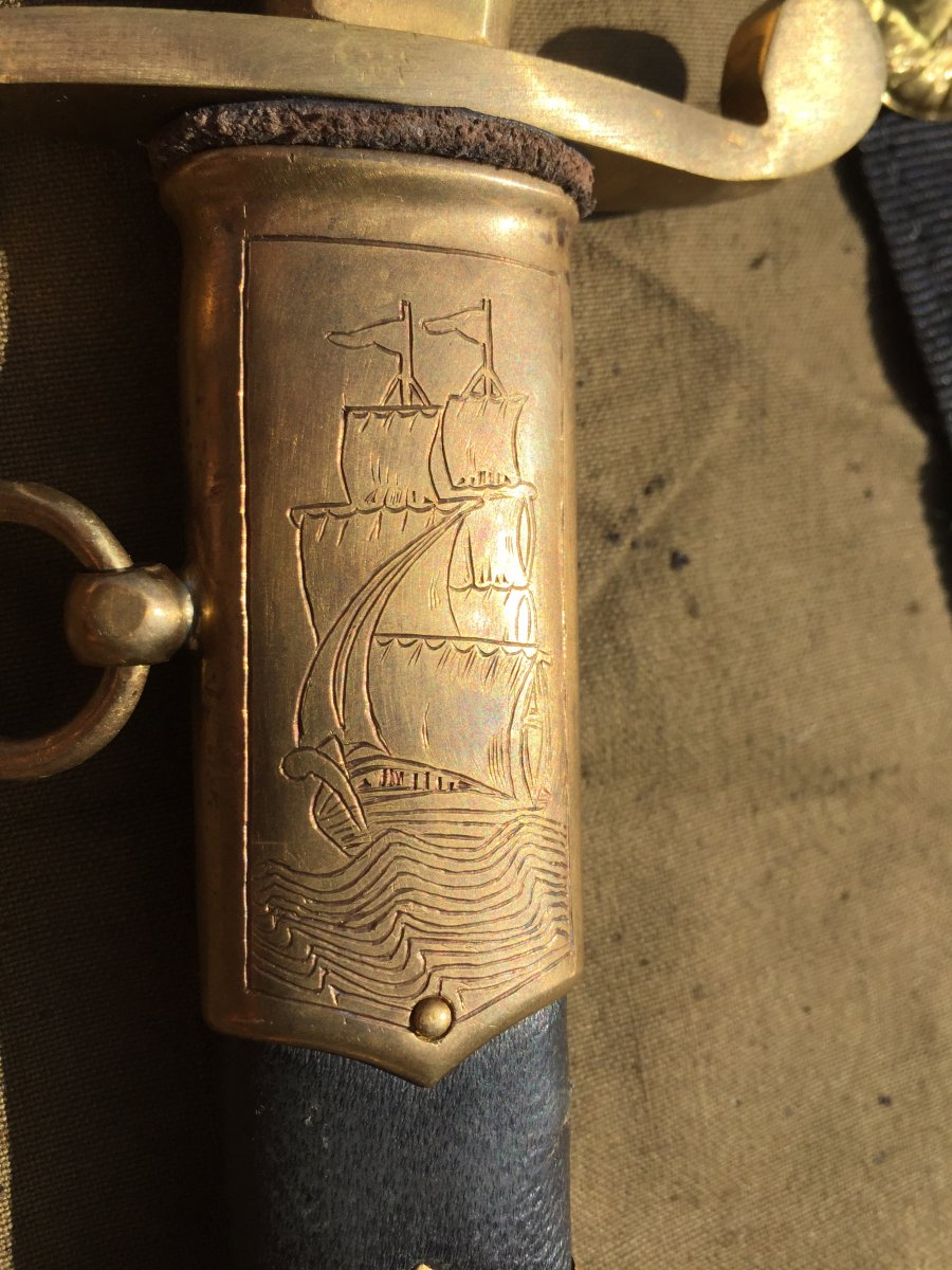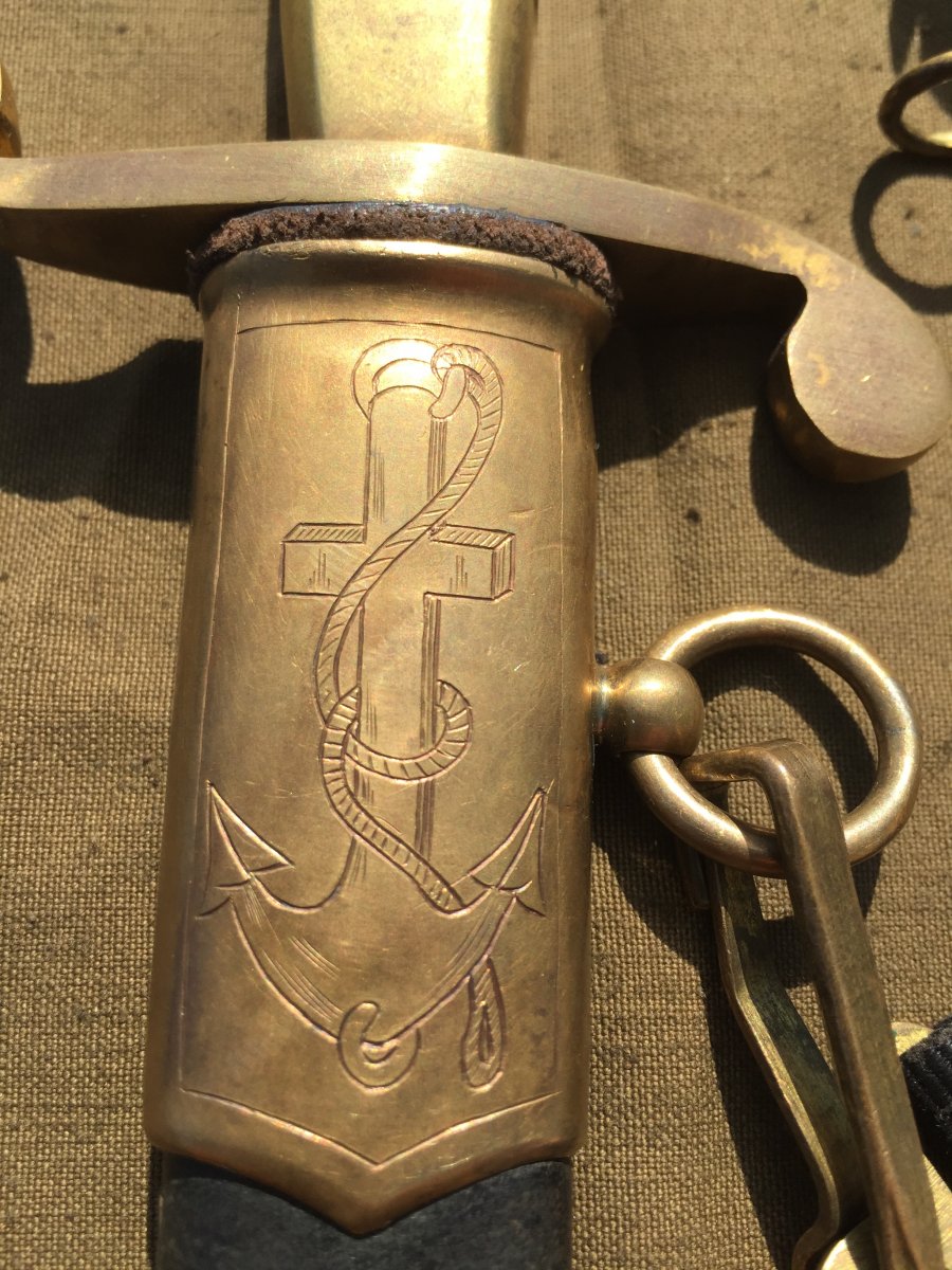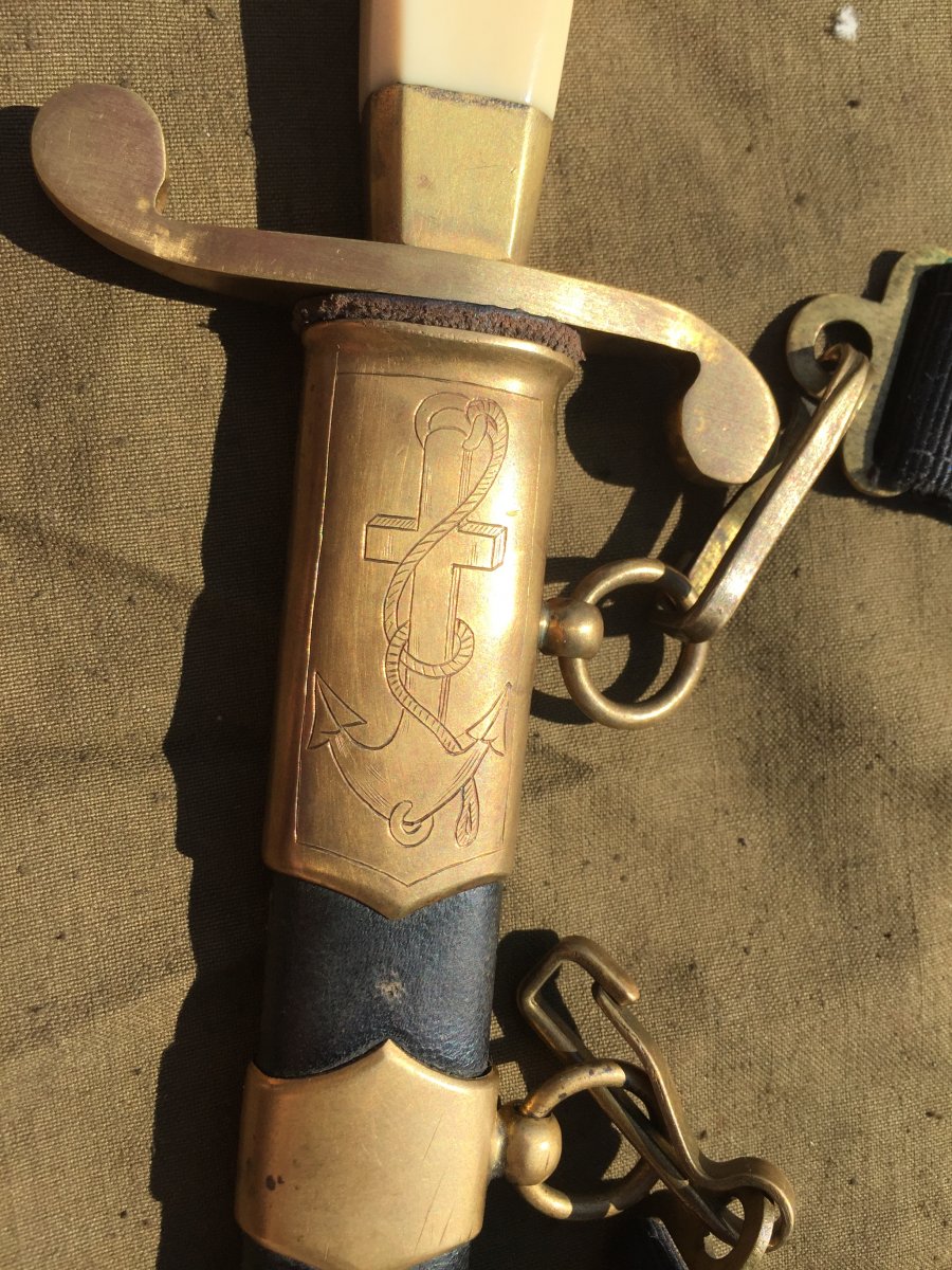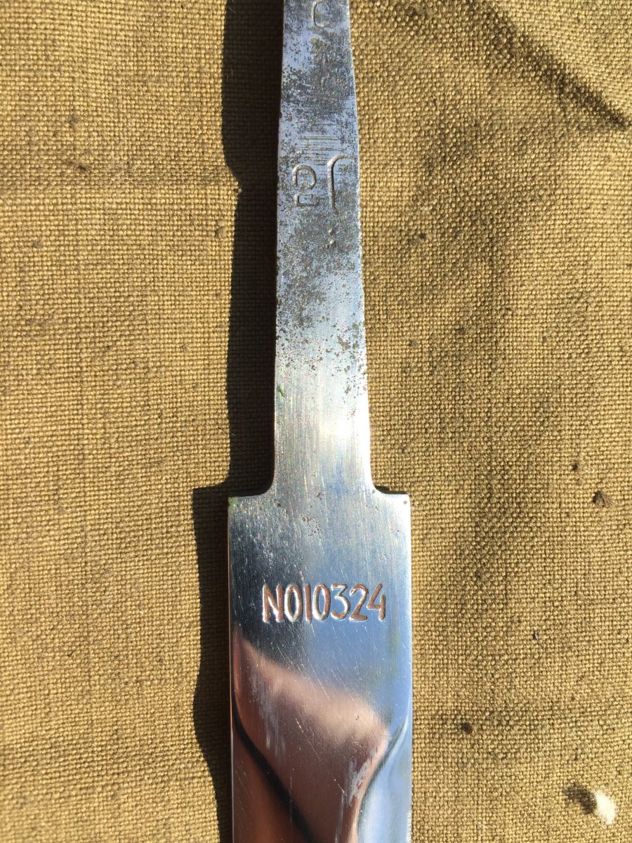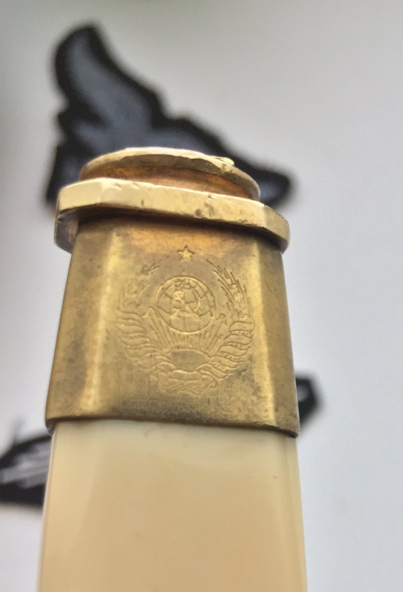 Продам кортик офицерский морской образца 1940г.(ранний безкнопочник).Номер 010324,Состояние:на лезвии видны следы от корозии,на гербе 11 республик,ручка похоже на слоновую кость или бивень моржа,все видно на фото!Историю этого предмета не знаю,таким он ко мне попал!В комплекте идет вахтенный подвес!Цена за все 6000 грн.