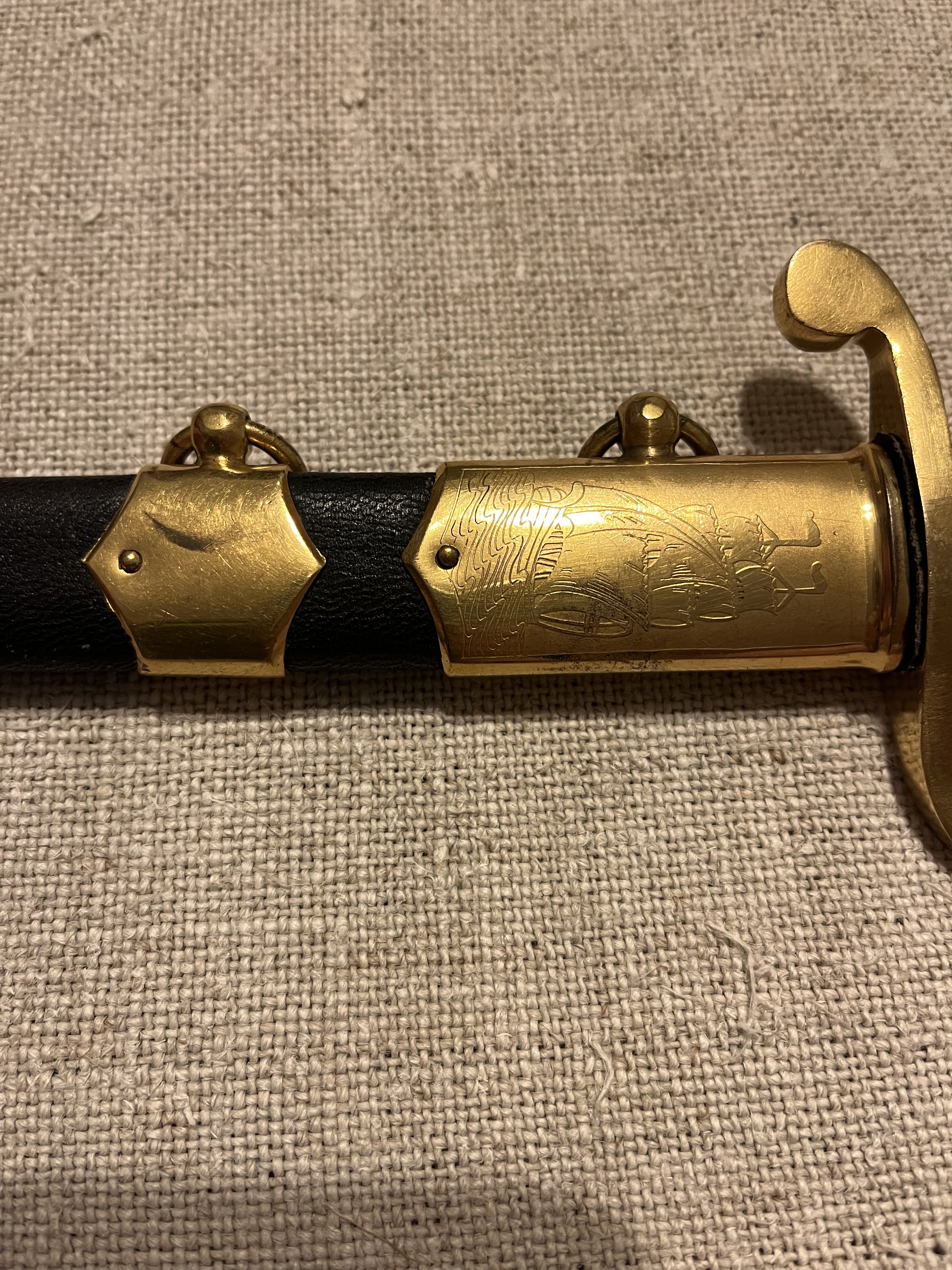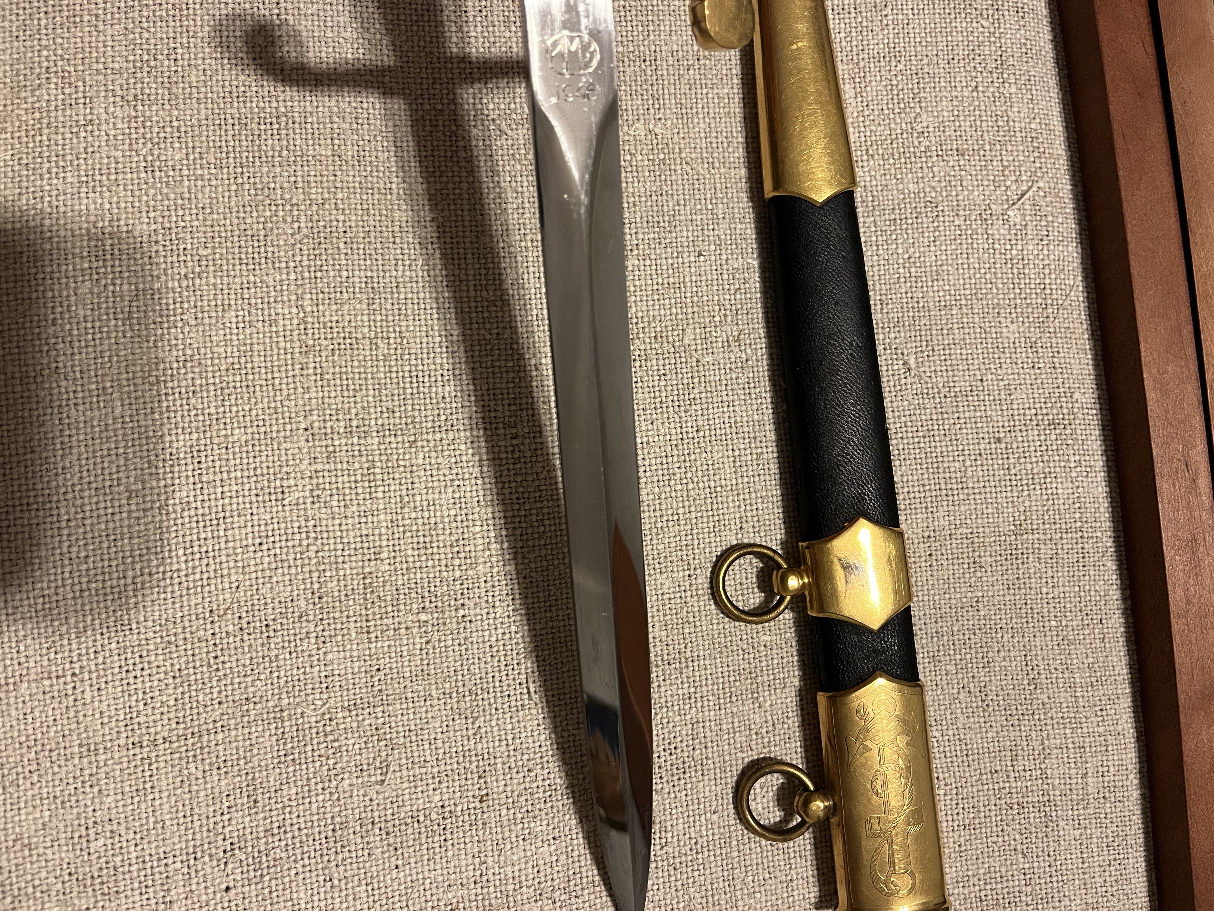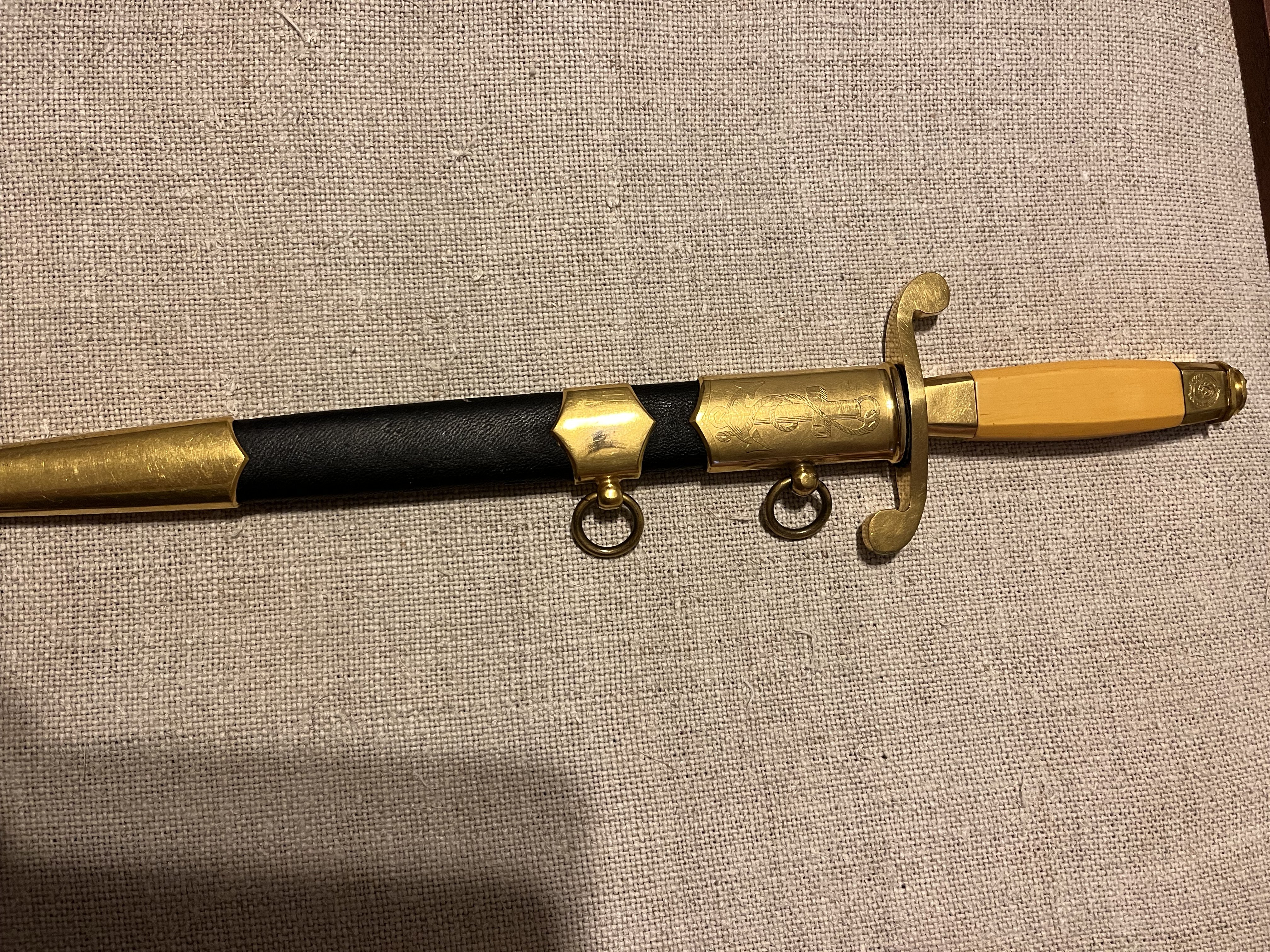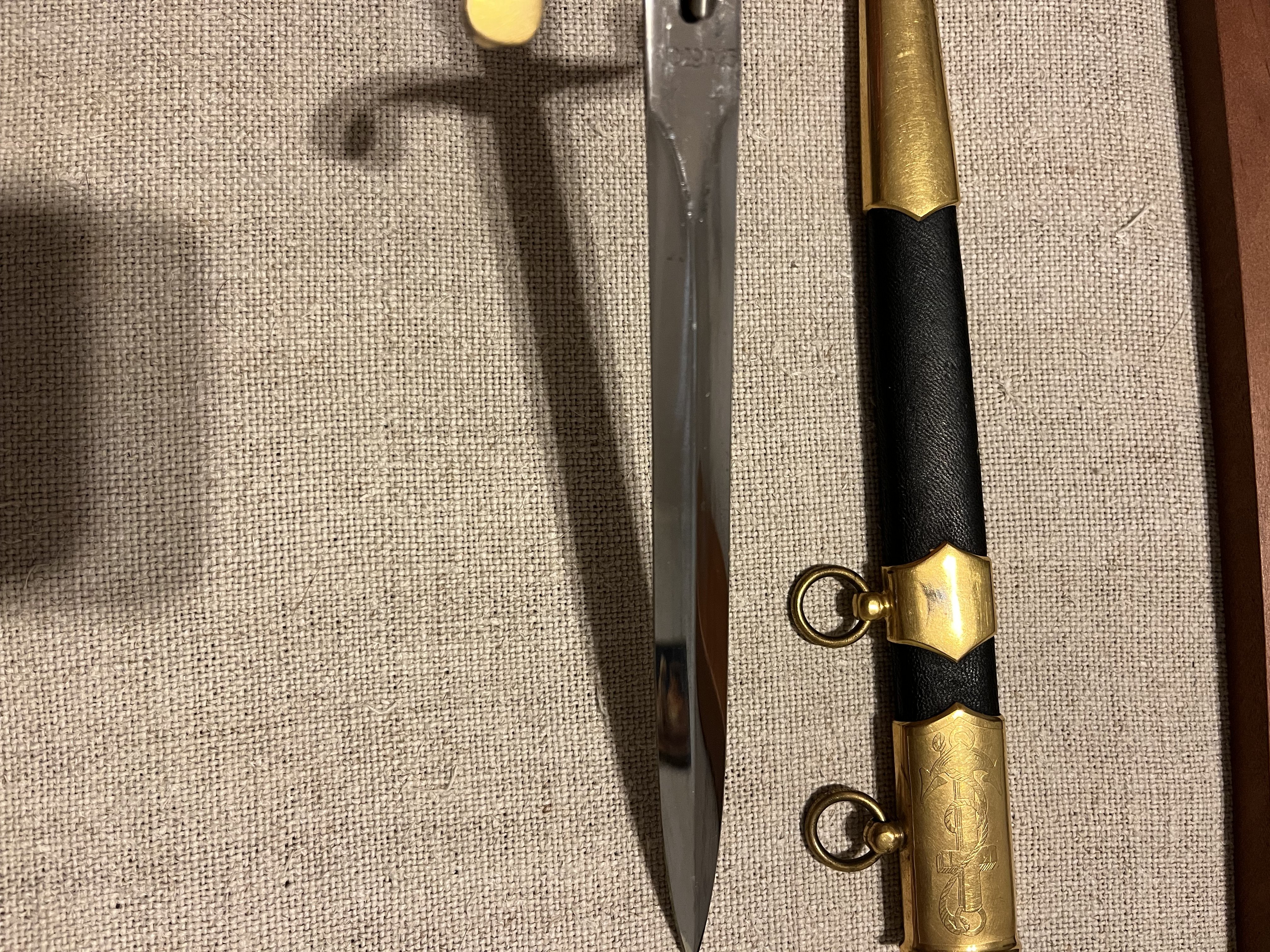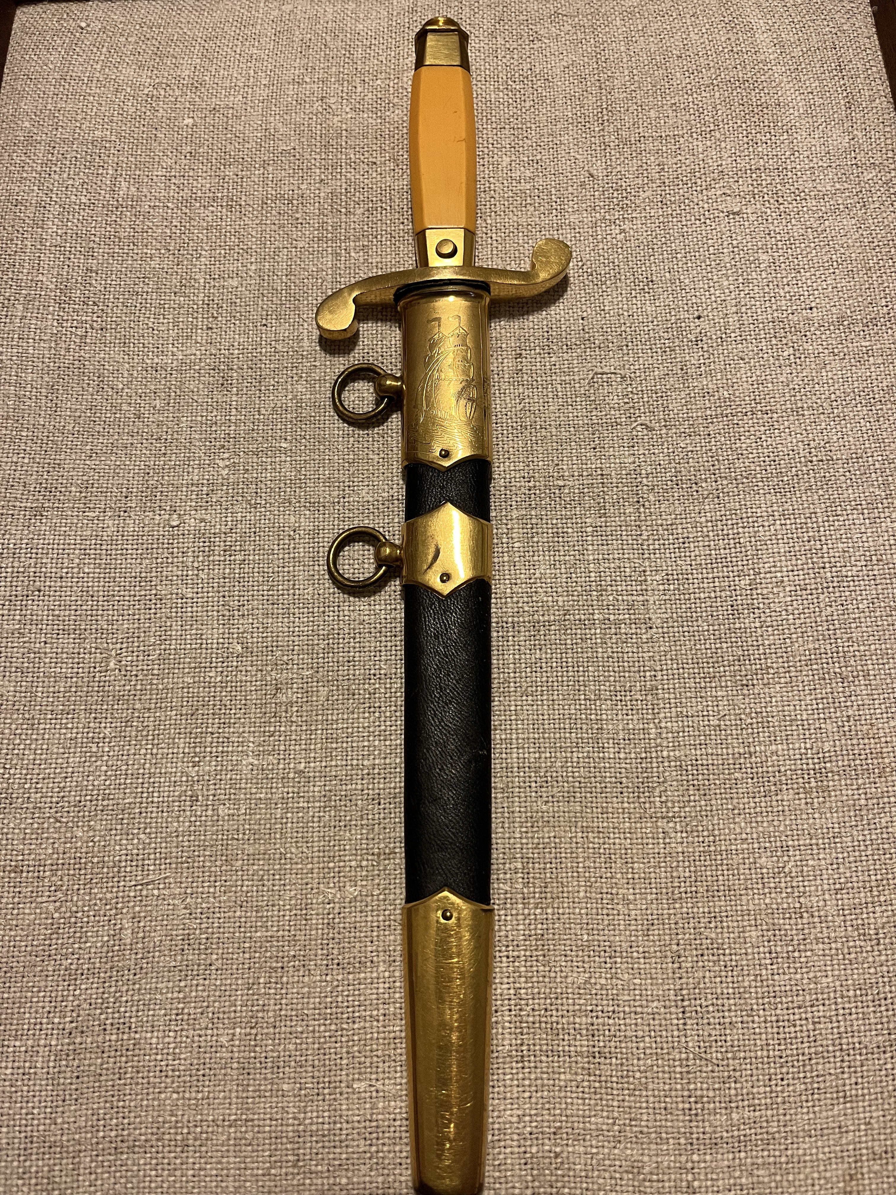 Доброго дня всім, прошу допомоги у оцінці даного предмету, ремінь не ношений в ідеалі , на лезі кортика є трішечки чорних пʼятен, за скільки реально продати зараз таку річ.