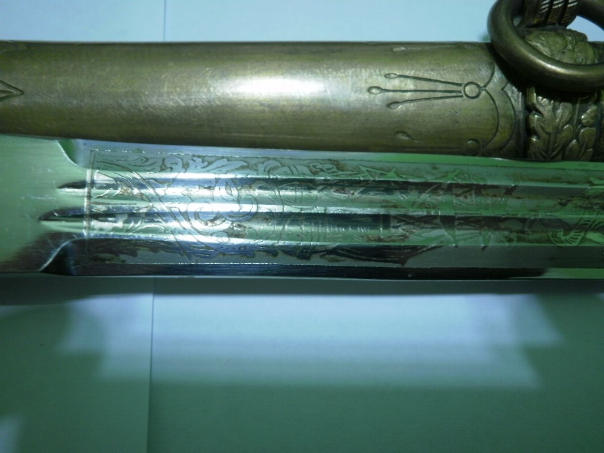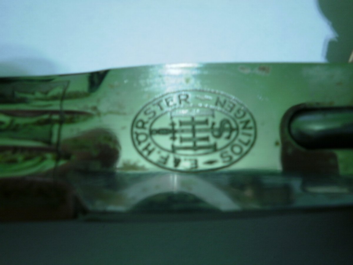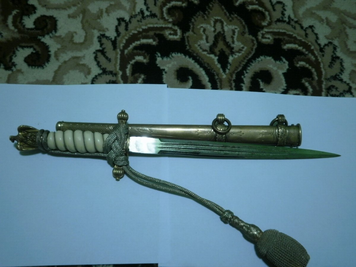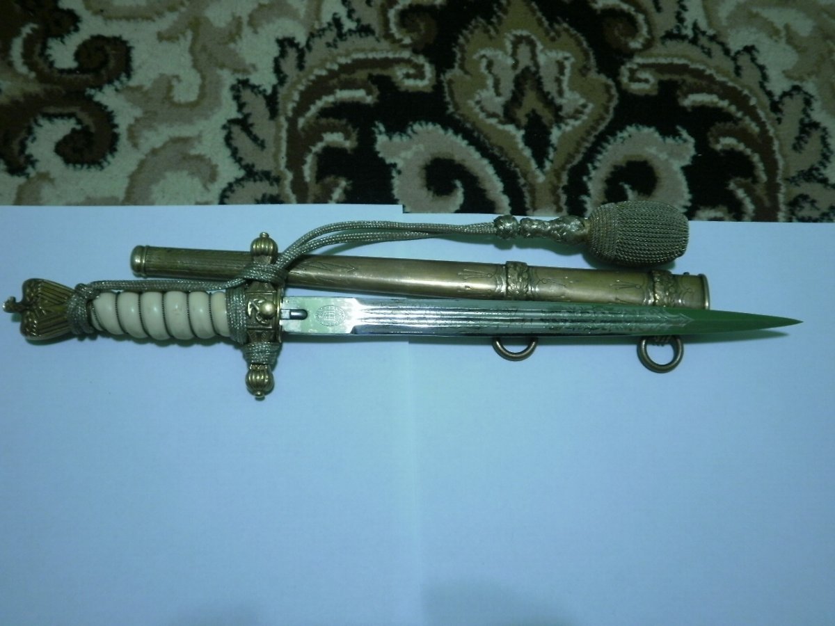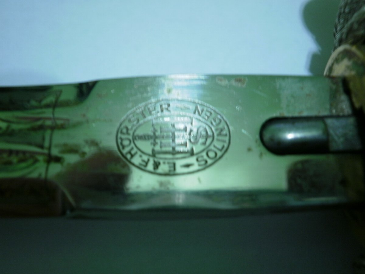 Кортик сборный. Навершие производства фирмы WKC. Мотив травления в виде парусника для Хёрстера, плюс расположение клейма со стороны защелки-это плохо. Рукоять я также считаю послевоенной. Ножны имеют шанс быть оригинальными, но рассматривать их нужно по другим, хорошим, фото. Если в этом есть смысл.