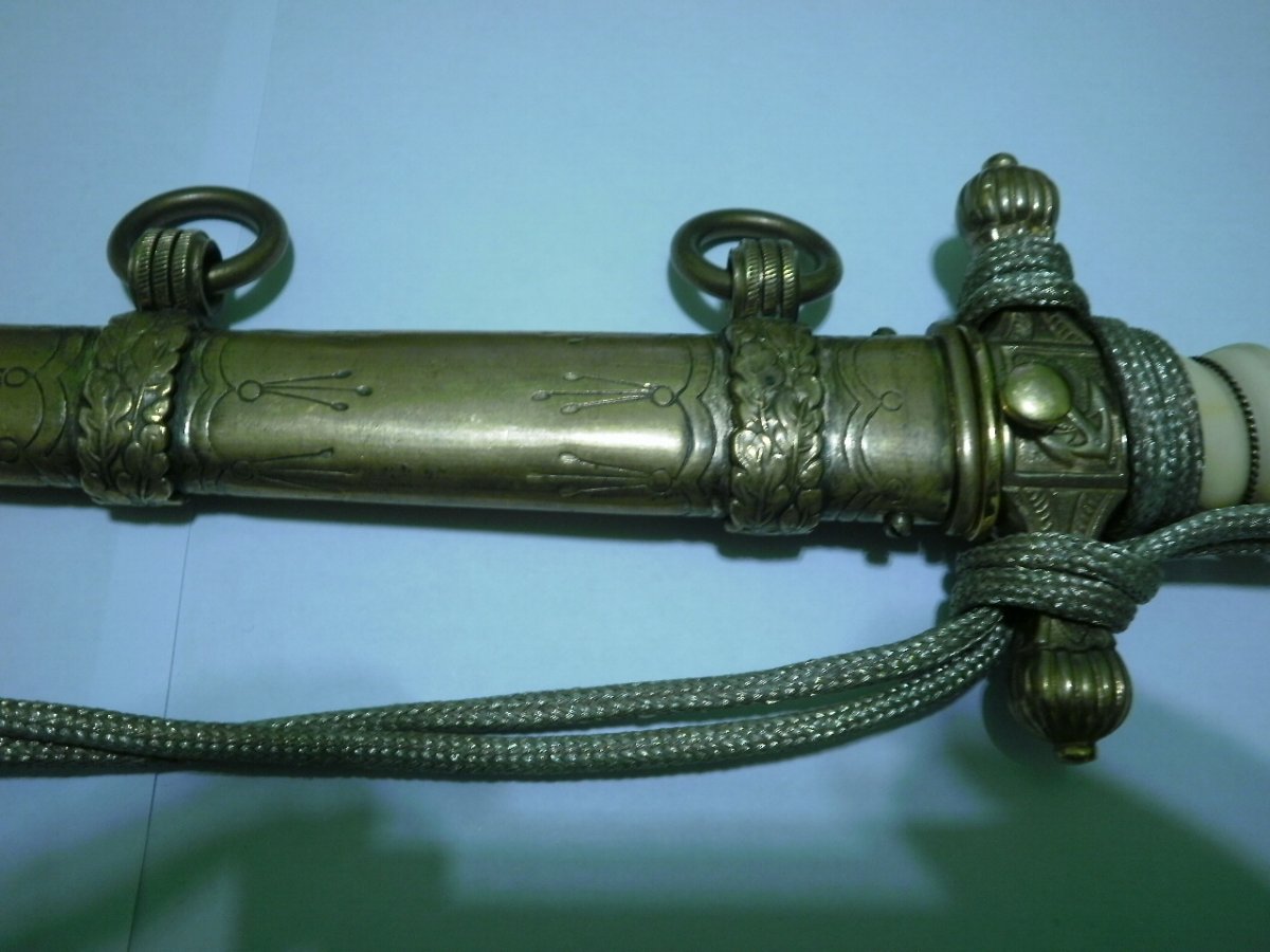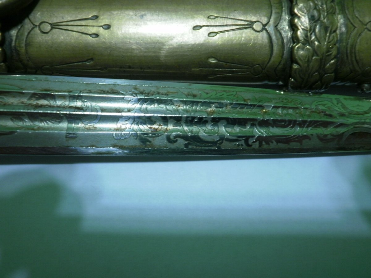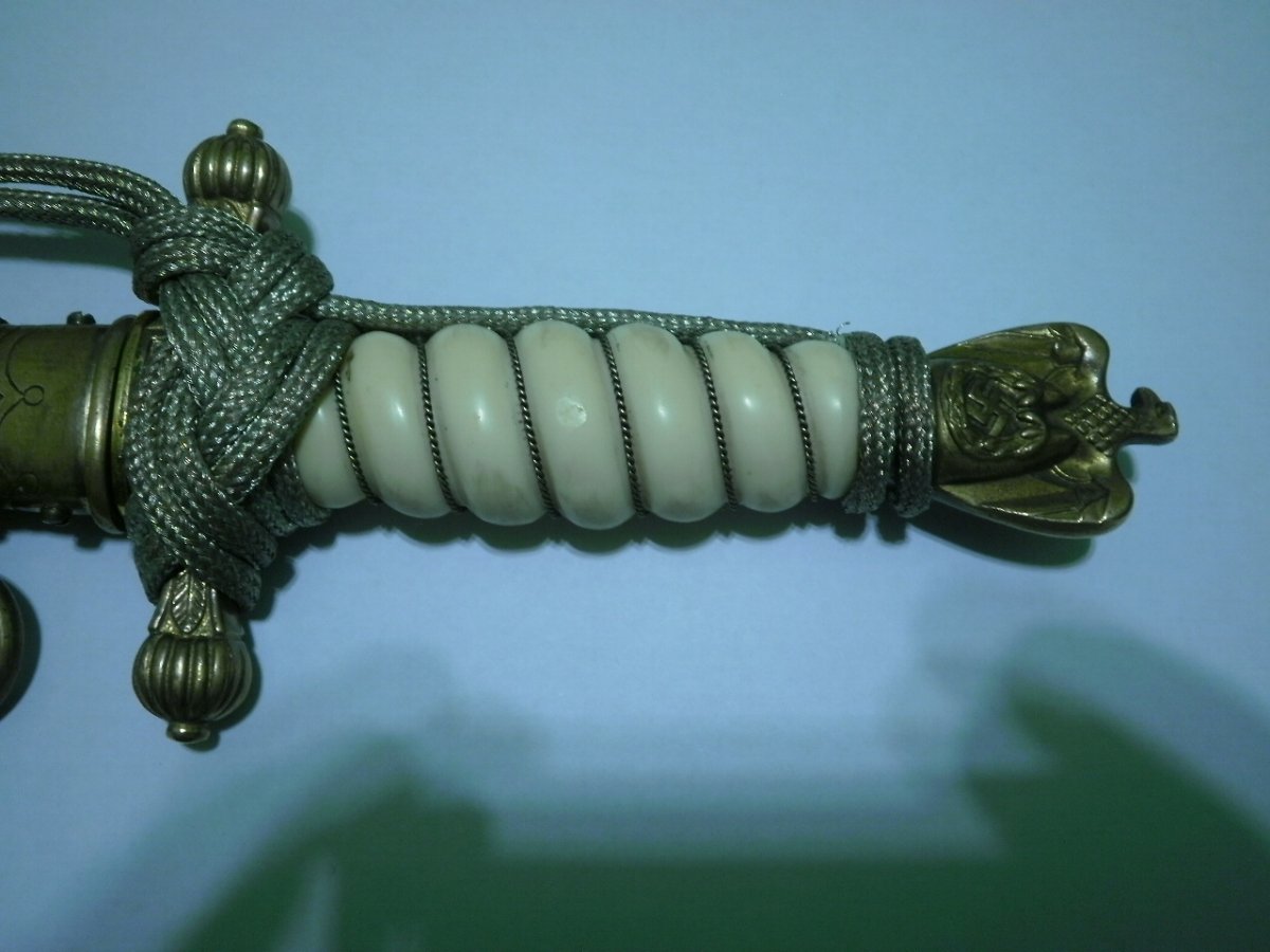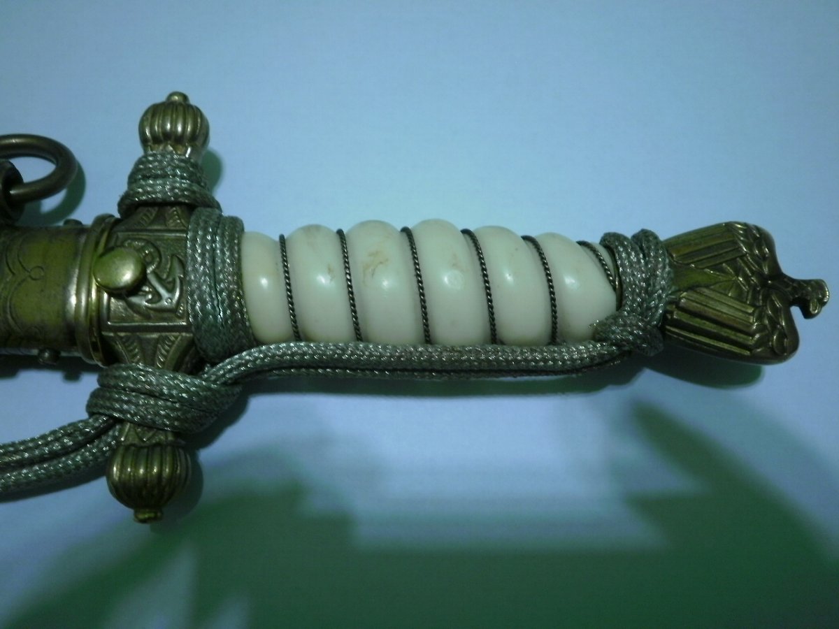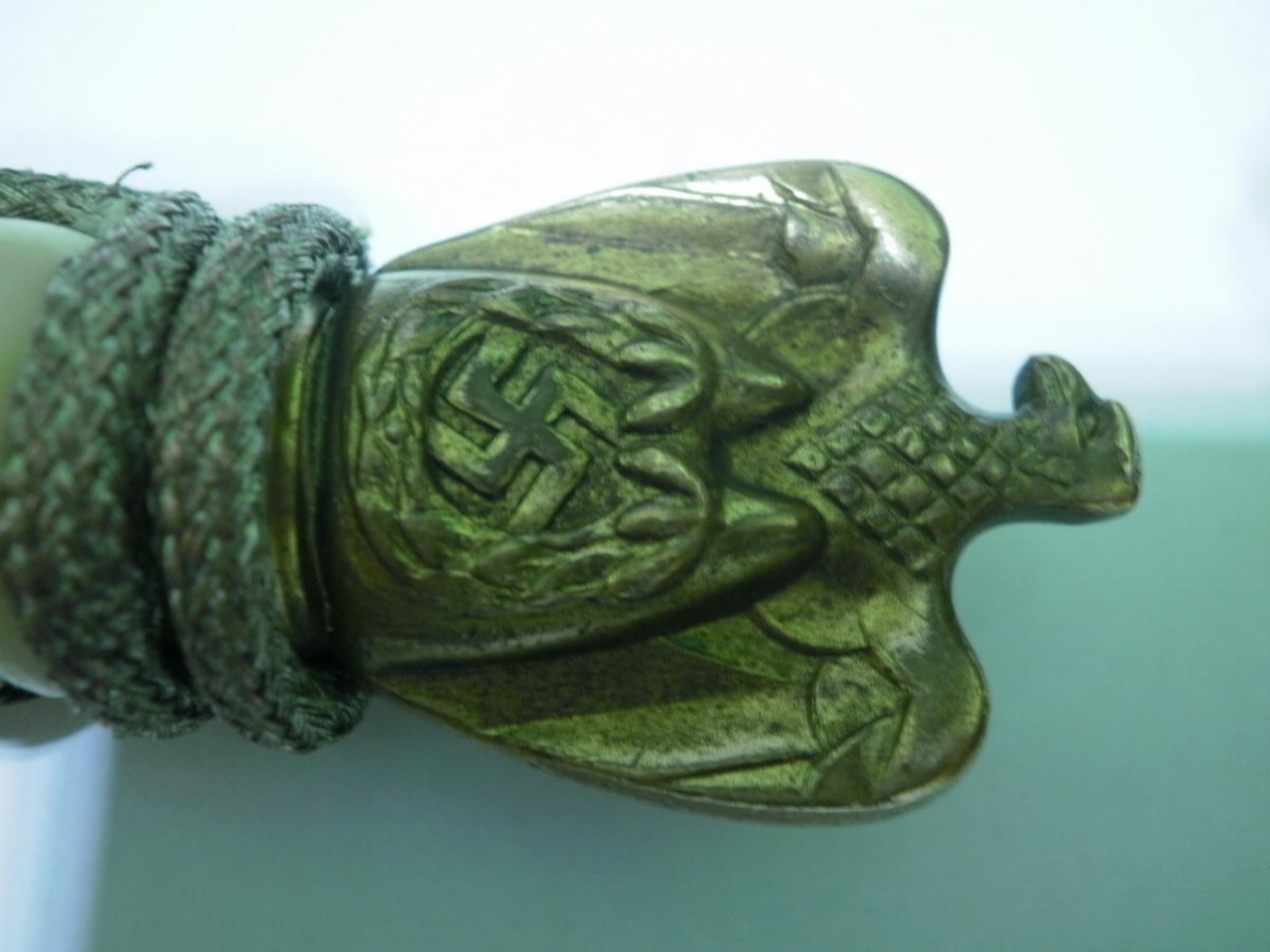 Кортик сборный. Навершие производства фирмы WKC. Мотив травления в виде парусника для Хёрстера, плюс расположение клейма со стороны защелки-это плохо. Рукоять я также считаю послевоенной. Ножны имеют шанс быть оригинальными, но рассматривать их нужно по другим, хорошим, фото. Если в этом есть смысл.