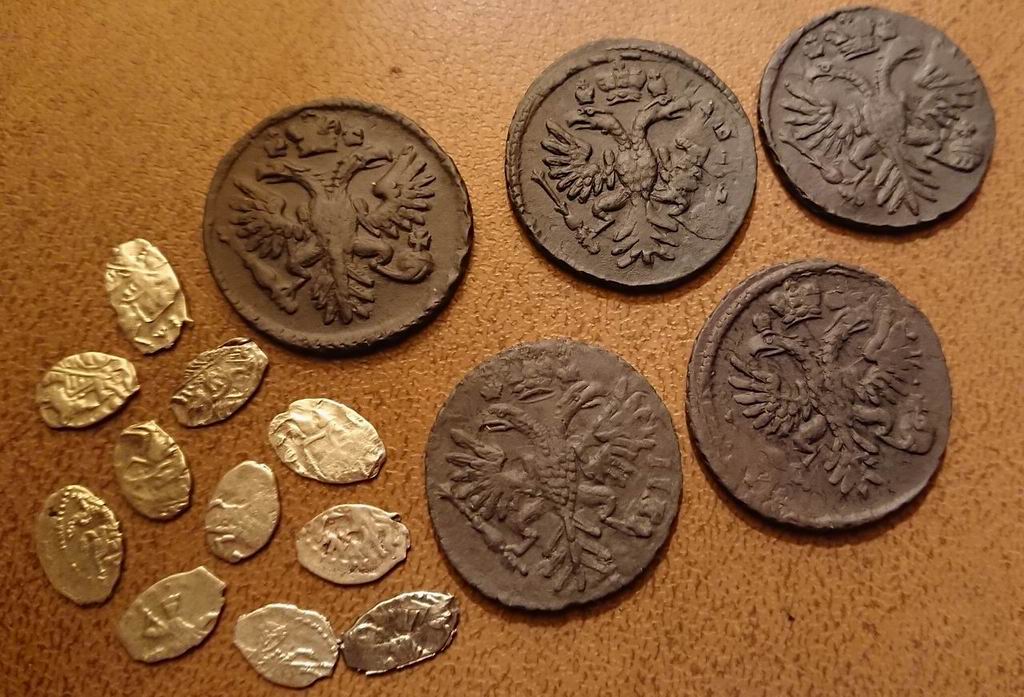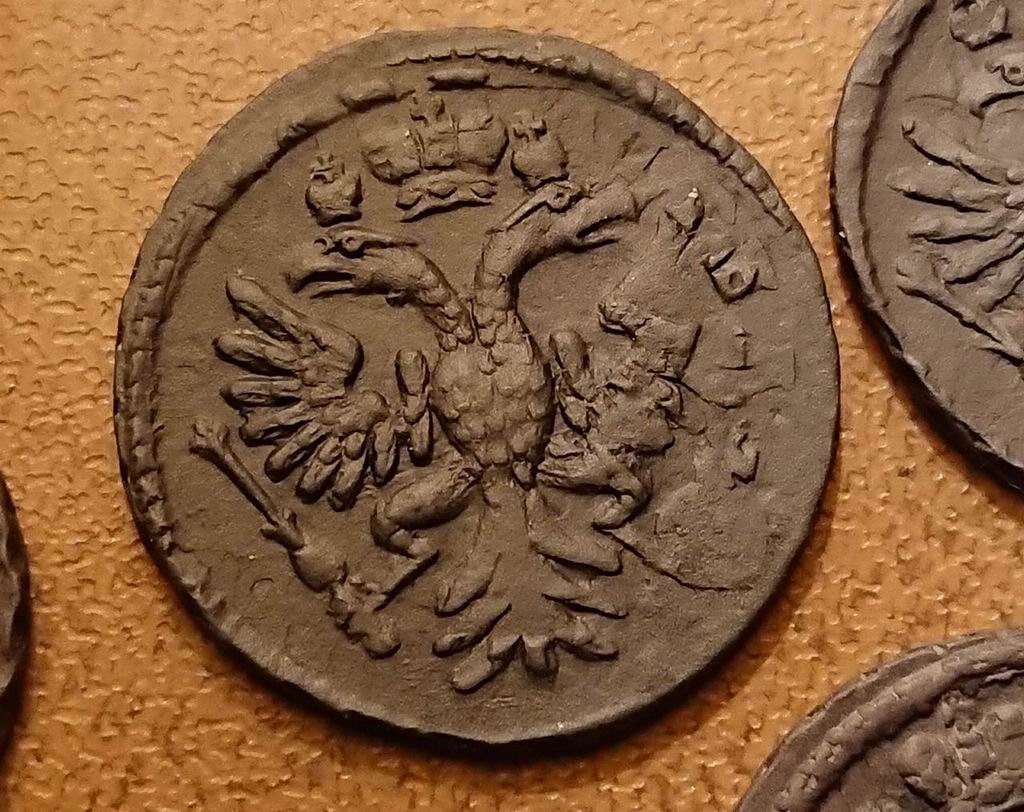 Если выложите петровские копейки поаккуратнее (чтобы буквы шли ровно, и коняшки тоже - не вверх ногами), то попробую определить их года и редкость. Пока этого не сделано - цена им по 25...35 р. за штуку. Они разные - вижу и Кадашевский и Старый денежный двор, начало 1700-х годов.