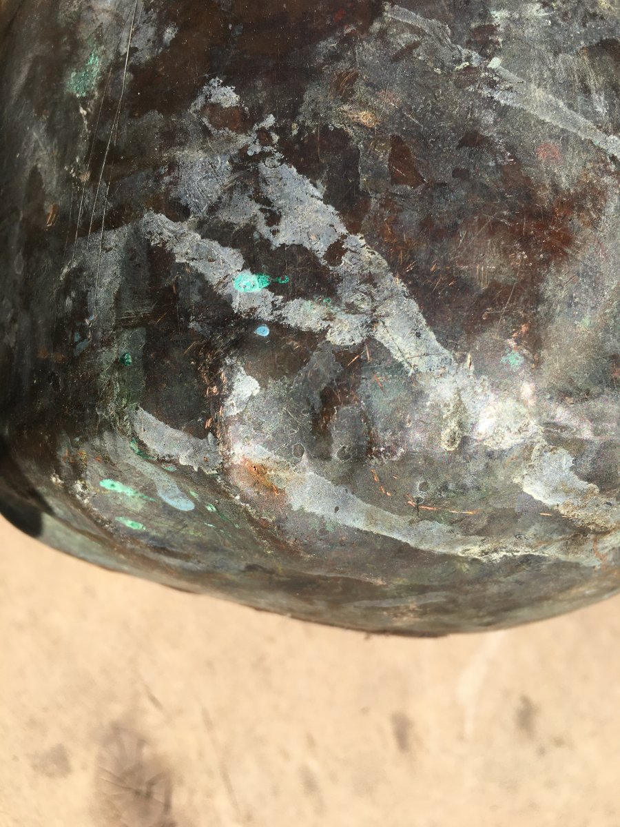 На медном из клейм стоит только кольчугин. На сгибе дна пробитие диаметром 0,4мм. Видимо упал с высоты на острие.