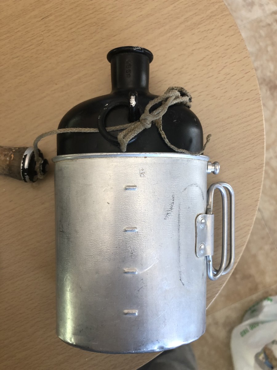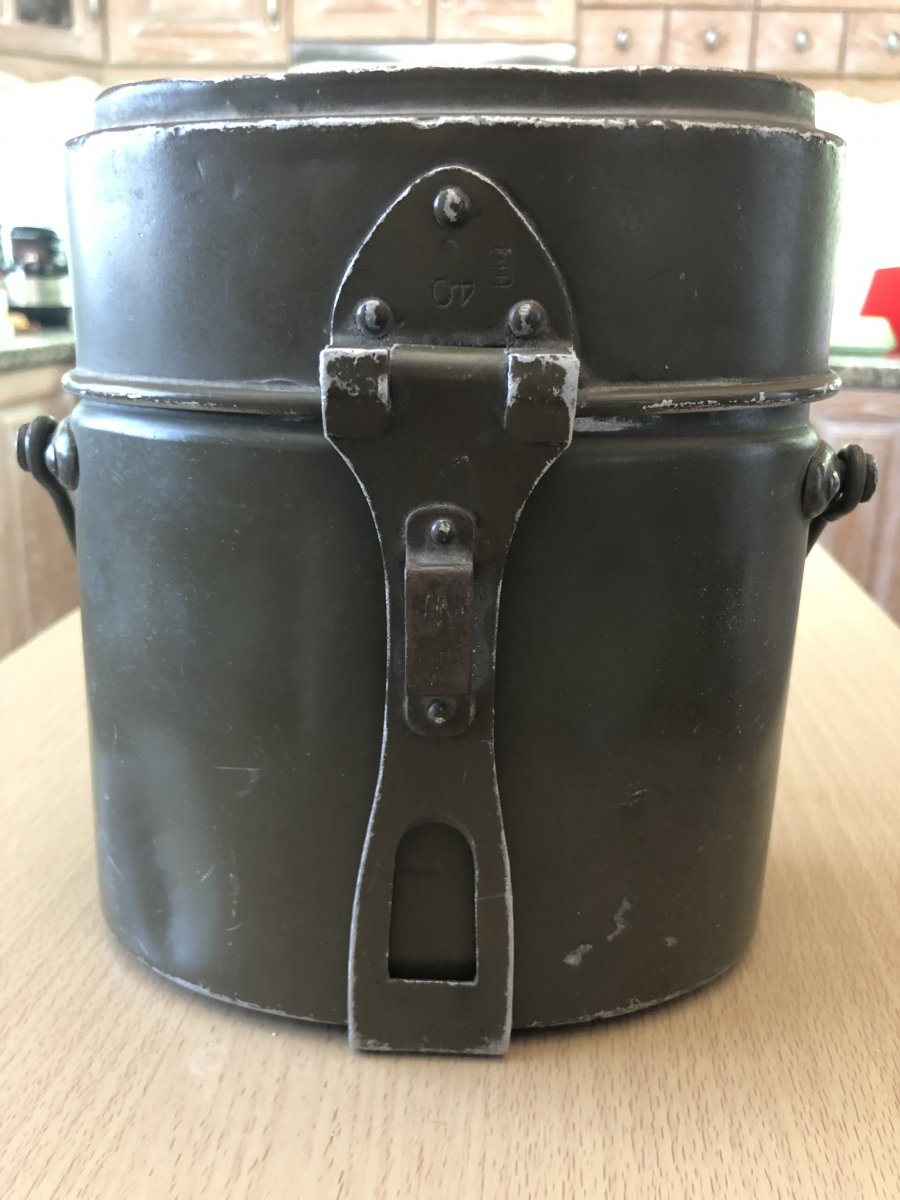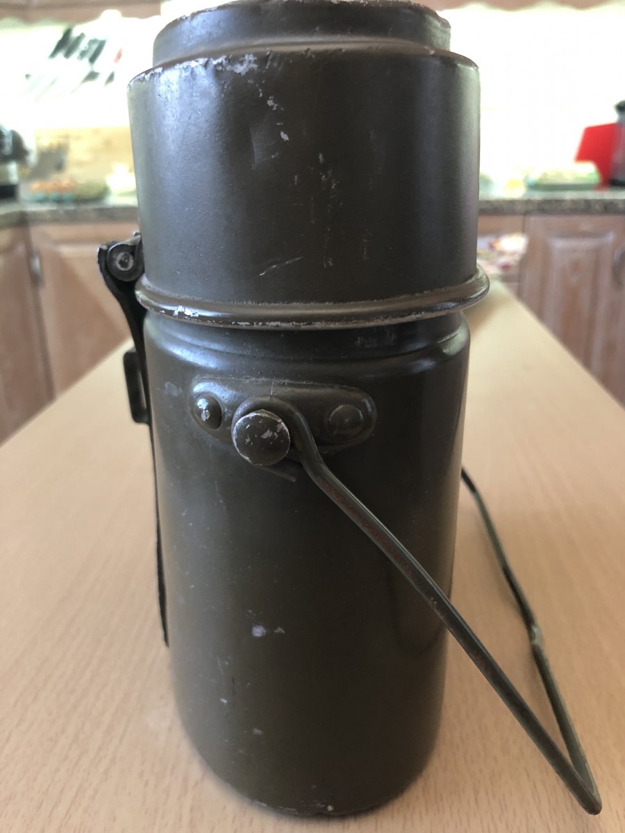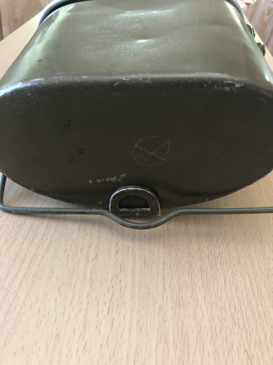 Усім доброго дня! Камради,допоможіть визначитись з цим «котлом». Придбав на барахолці у Іспанії. Всередині,бонусом невелика фляжка,що входить у стакан з відкидними ручками,та ложко-виделка,судячи з клейм,швейцарська. Цікавить виробник самого котла,та роки виготовлення. Усім дякую!