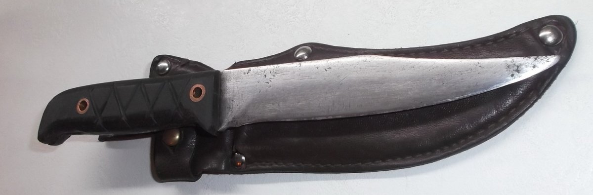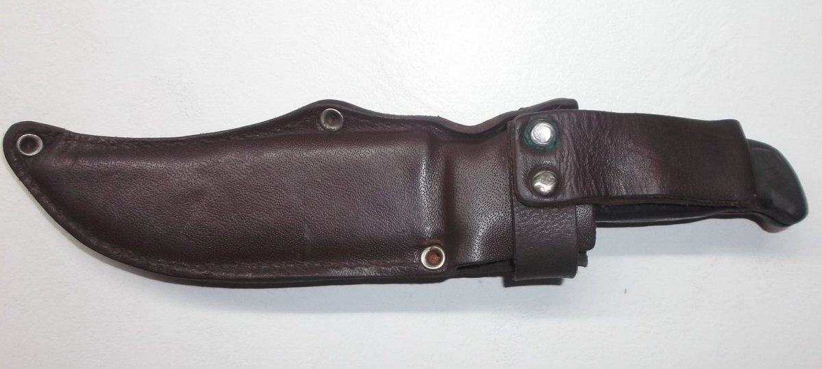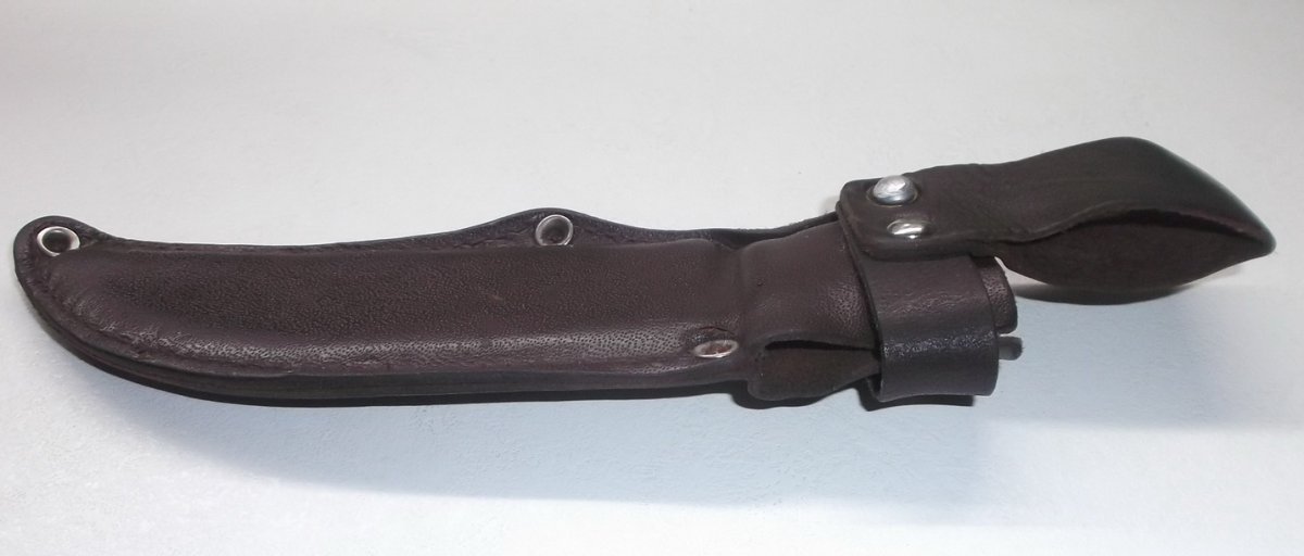 Фабричный кожаный чехол б/у от охотничьего ножа. Нож самодельный. Общая длина ножа - 225 мм, длина клинка - 130 мм, ширина клинка - 24 мм, толщина – 2 мм. Ручка из текстолита. Все следы ремонта и использования на фото Цена 150 грн. Предоплата на карту Приватбанка, пересыл за счет покупателя: Укрпочта, Новая Почта.