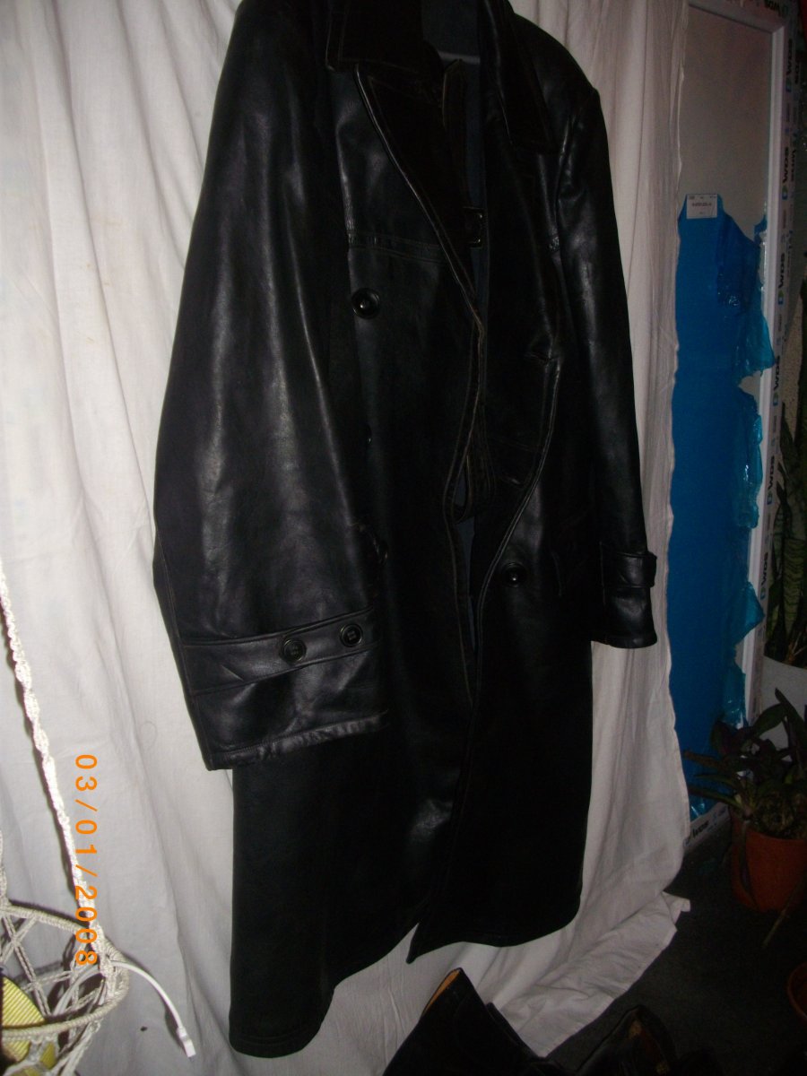 Кожаный плащ(офицерский возможно), 48-50 размер. В хорошем состоянии, кожа не потерта, не выцвела.Местами есть дефекты, совсем незначительные.Подкладка в хорошей сохранности, без дыр и подобного. Лет 20 висел в чулане. Принадлежал отцу, он был военный человек, отсюда предположение о "офицерской категории" изделия. В нагрузку хромовые зимние сапоги, оттуда же.Новые, при жизни никто их не носил.Подбиты, на меху. Размер 41-42