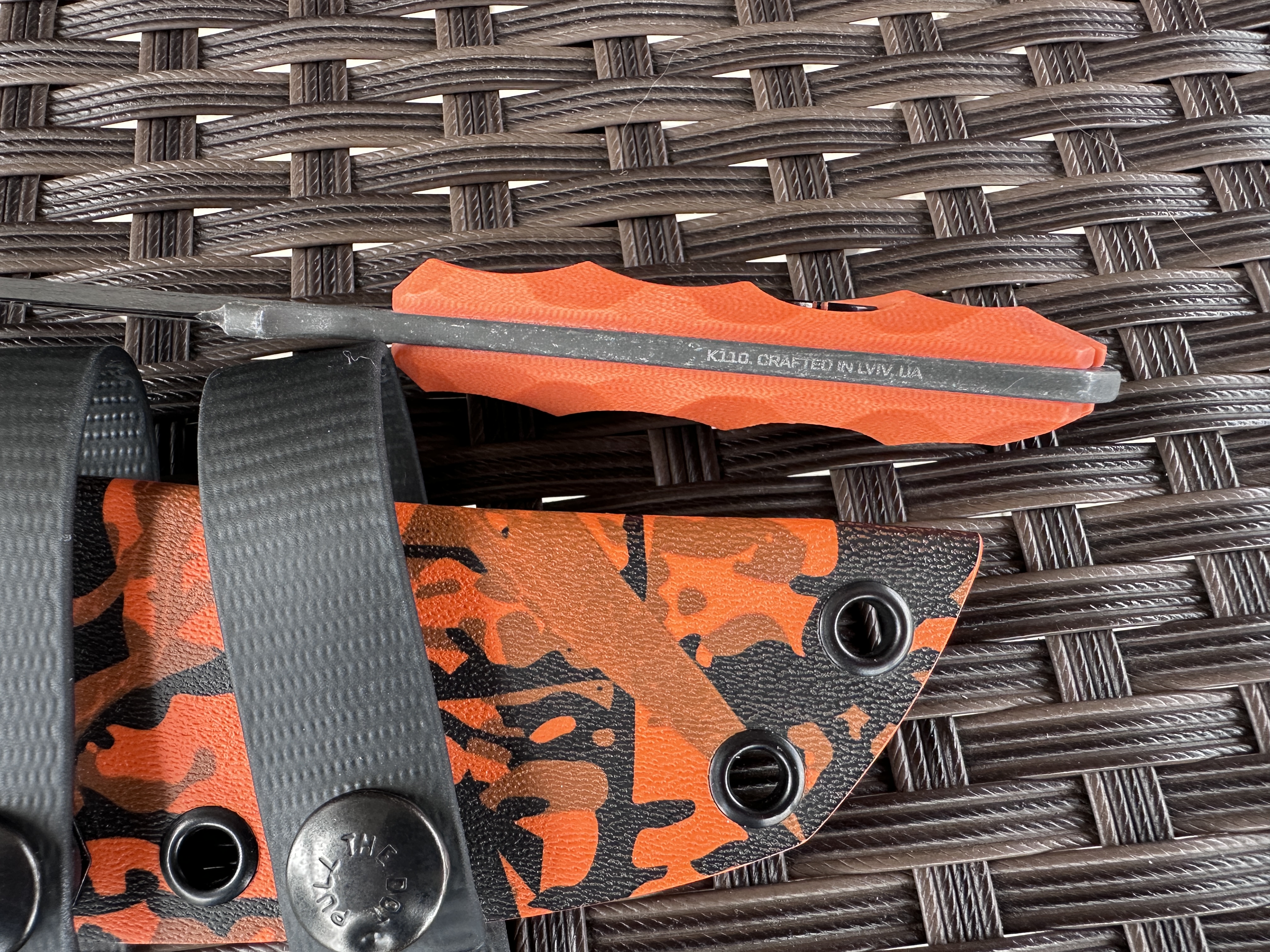 KravaCut Полоз оранж Ніж новий! Без використання! Е маленькі не значні потертості від ножен. Отлично держать в руку для нарезки продуктов и также для тактического хвата. Ціна: 7500 гривень. оплата по домовленості. Пересилка за рахунок покупця. Загальна довжина - 185 мм Довжина клинка - 90 мм Товщина клинка - 3,2 мм Конструкція - Фултанг Сталь - Інструмент. сталь К110 Твердість - 60HRC Фініш - Блеквош Руківя - G10, титановий болт зі сплаву GR5 Піхви - Кайдекс з поясним кріпленням