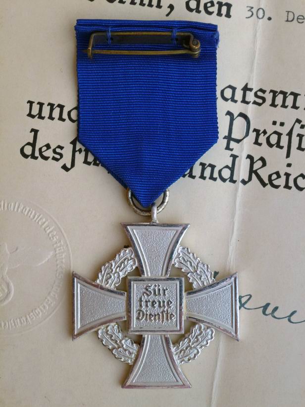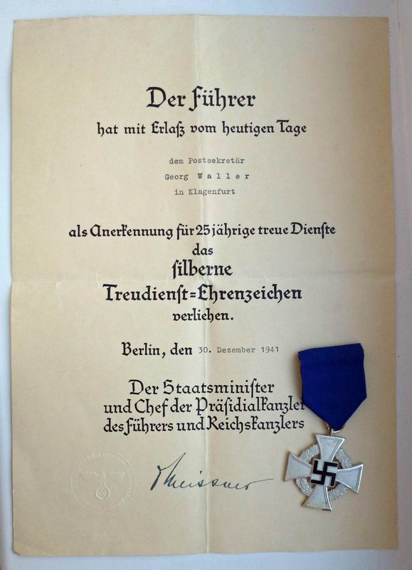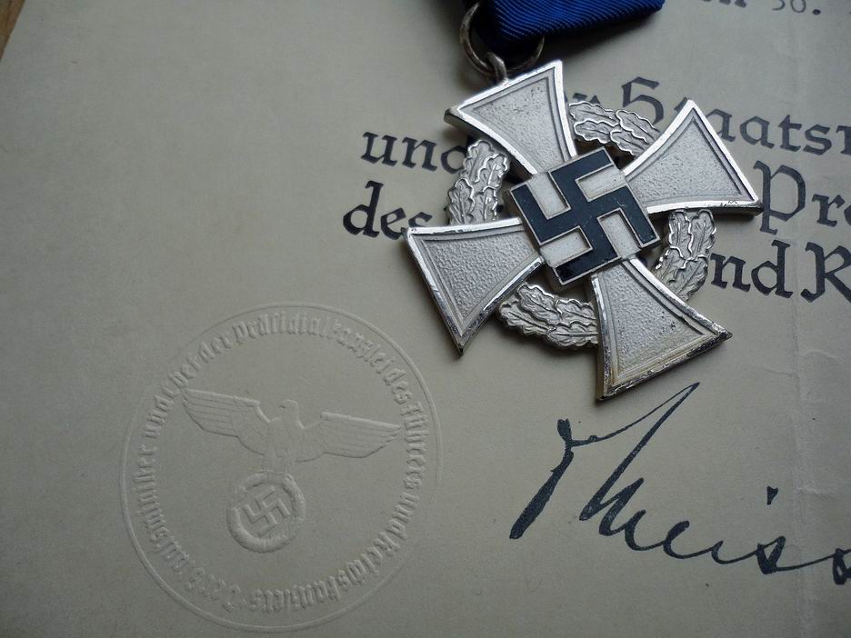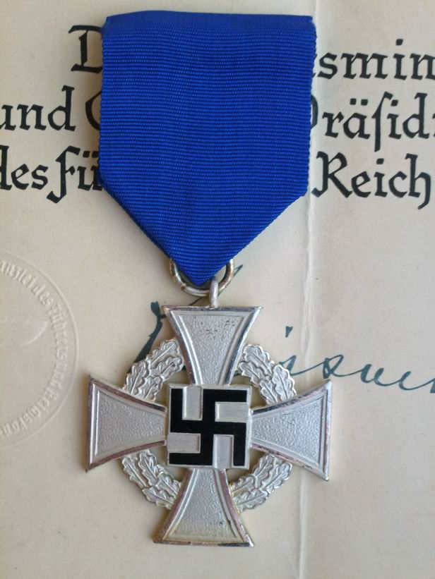 Крест «За 25 лет безупречной службы» с документом Оригинальный крест с оригинальной лентой и наградным документом. На документе стилизованная печать в виде орла. Состояние хорошее, также сохранилось оригинальное «немецкое серебрение» на кресте. 3500 руб.