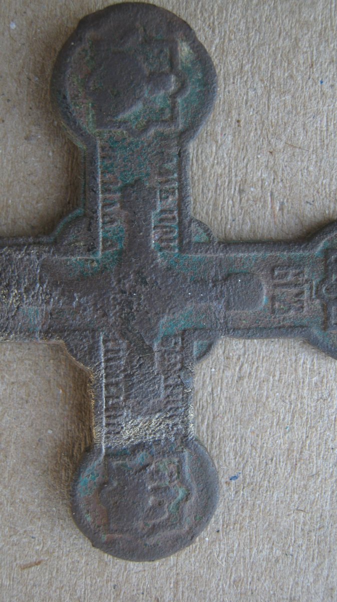 вітаю. хрест 19 - початку 20 століття, штамп. на ньому напис - "Бог нам прибежище и сила, а спасение крест". (Псалтир, Псалом 45:1). на вертикалі хреста (зверху вниз) - св.Миколай та св. Георгій Побідоносець, на горизонтальній балці(зліва направо) - св. Олександр Невський та архангел Михаїл. у центральній частині - "Всевидяче Око".