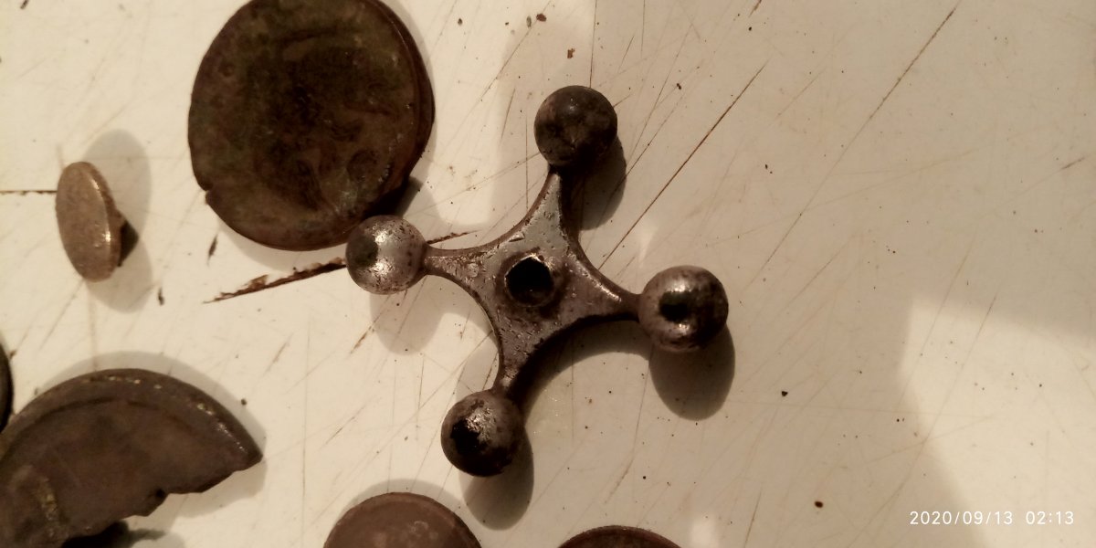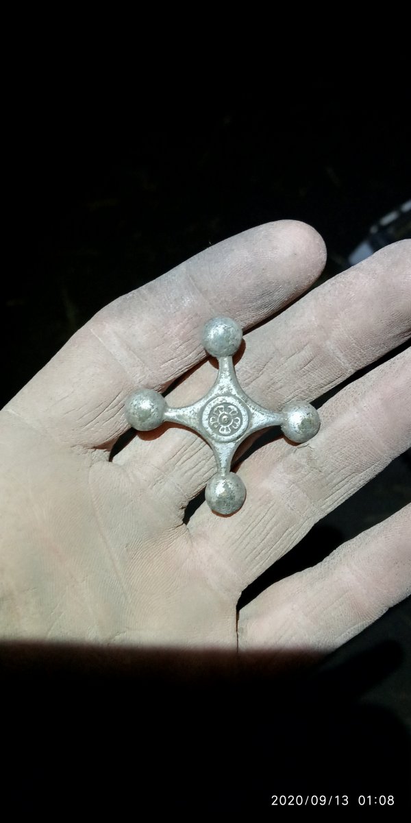 Здравствуйте. Попался такой вот предмет. Впервые вижу, напоминает крестик, ушка нет, с другой стороны отверстие, в нем резьбы не видно. Материал похоже бронза в серебрение. Может кто встречал подобное. Думал может от крана водопроводного, но смущает размер, и украшение в виде цветка. IMG_20200913_010807.jpg IMG_20200913_021344.jpg