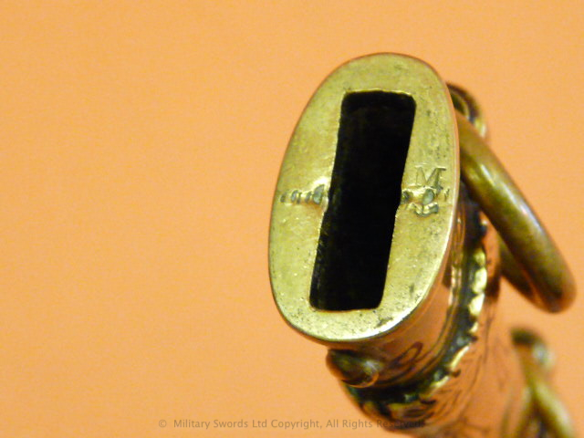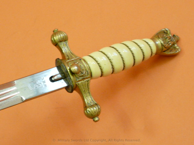 Что касается навершия, то причин неправильного разворота может быть много. Самые распространенные: навершие отпущено во избежание растрескивания целлулоида рукояти, либо кортик был модели М29 и имел навершие в виде связки тростника, которое было заменено на переходного орла, который не подходит идеально. Но М29-это не Ваш случай, поскольку орел не переходной, а WKC.