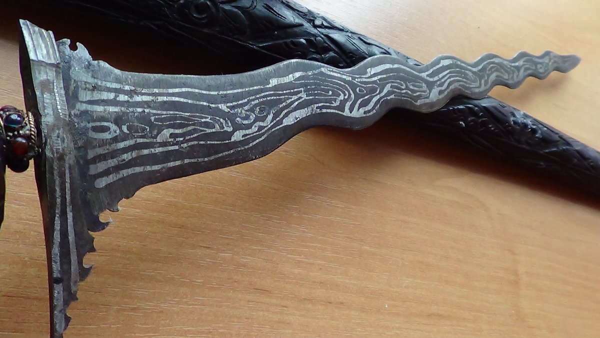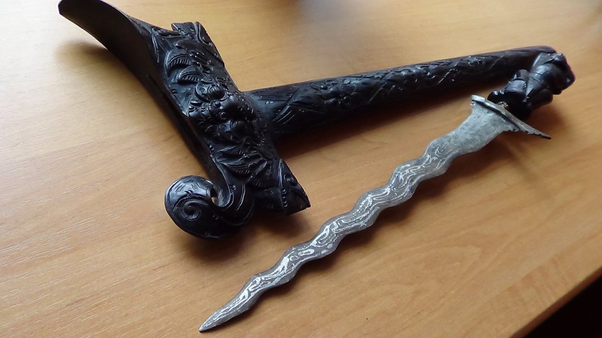 Крис ориентировочно 50-х годов прошлого века. Общая длина с чехлом 66 см.,длина самого ножа 53 см. Родиной орудия является остров Ява, расположенный в Индонезии. Клинок имеет волнообразную форму,и имеет 11 волн сиволизирующие-благородство, великодушие, богатство. Клинок выполнен из многослойной дамасской стали с красивым узором. Рукоять и чехол выполнены из ценных пород черного дерева. Нож в прекрасном коллекционном состоянии. Цена-16800грн.
