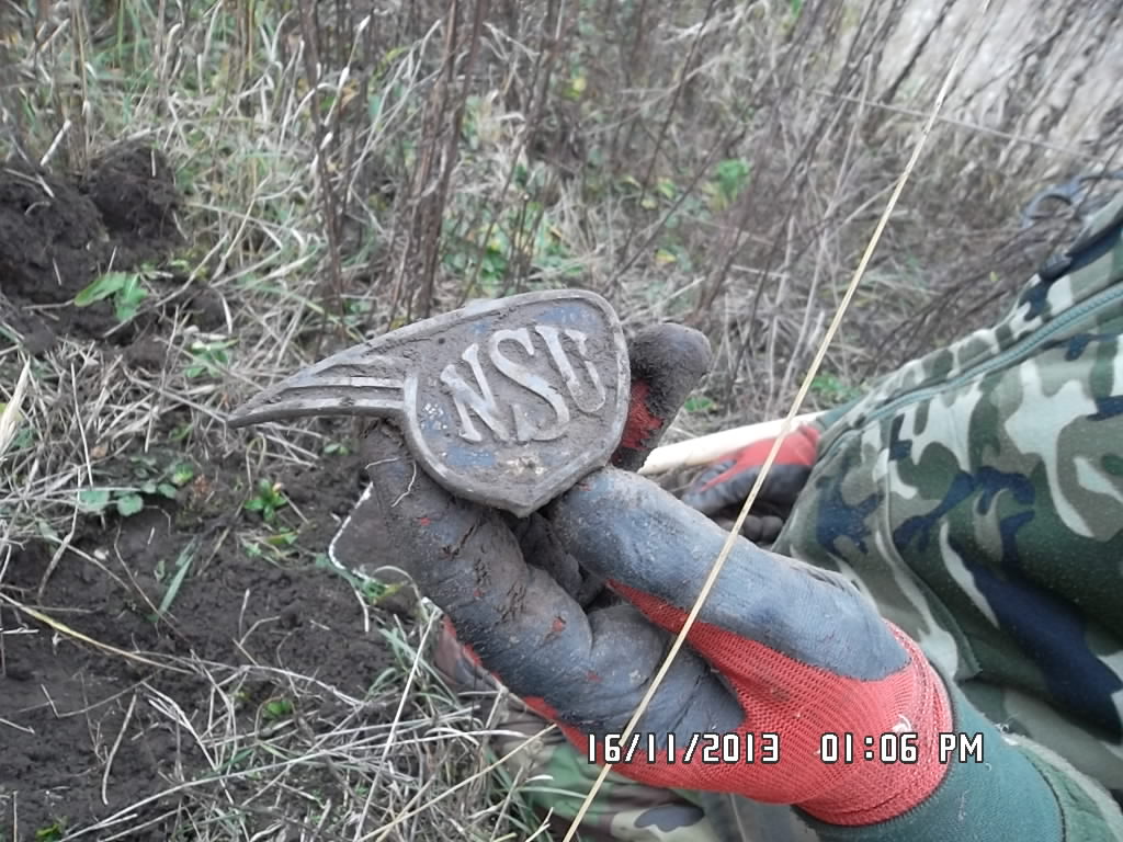 шильдик двустороний....может с велосипеда..Крышка с фильтра уже по второй мировой....шильдик НСУ..мог быть и ПМВ..В том месте историчиская наслоенка...