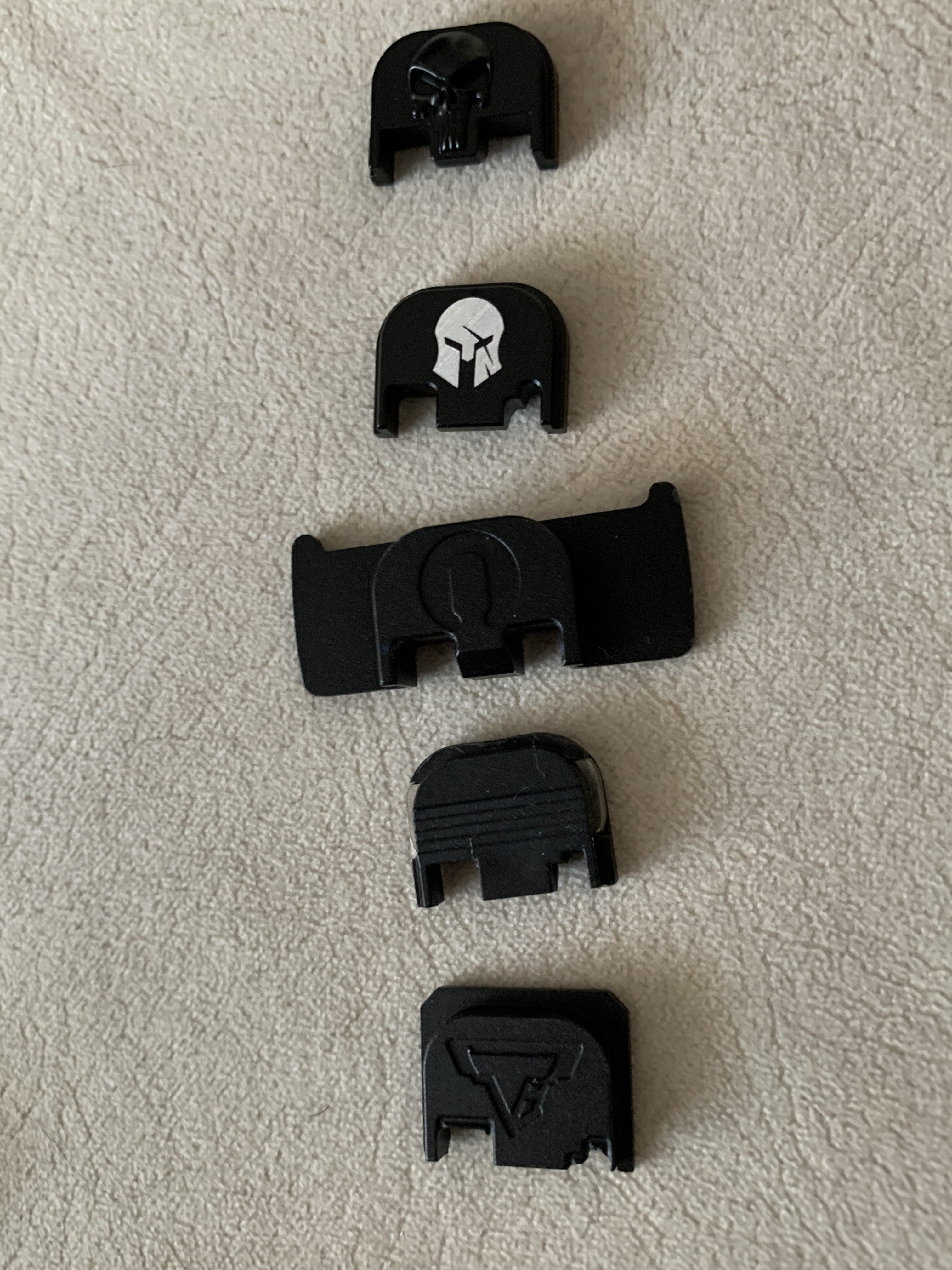 1- кришка з 3-D черепом Ціна 1500 грн 2- кришка з білим малюнком Ціна 1000 грн 3- кришка для покращення взведеня( з «вухами») Ціна 1200 грн. 4- оригінальна кришка Ціна 700 грн 5- заготовка з логотипом Tyran Ціна 500 грн Всі з алюмінію окрім штатної.