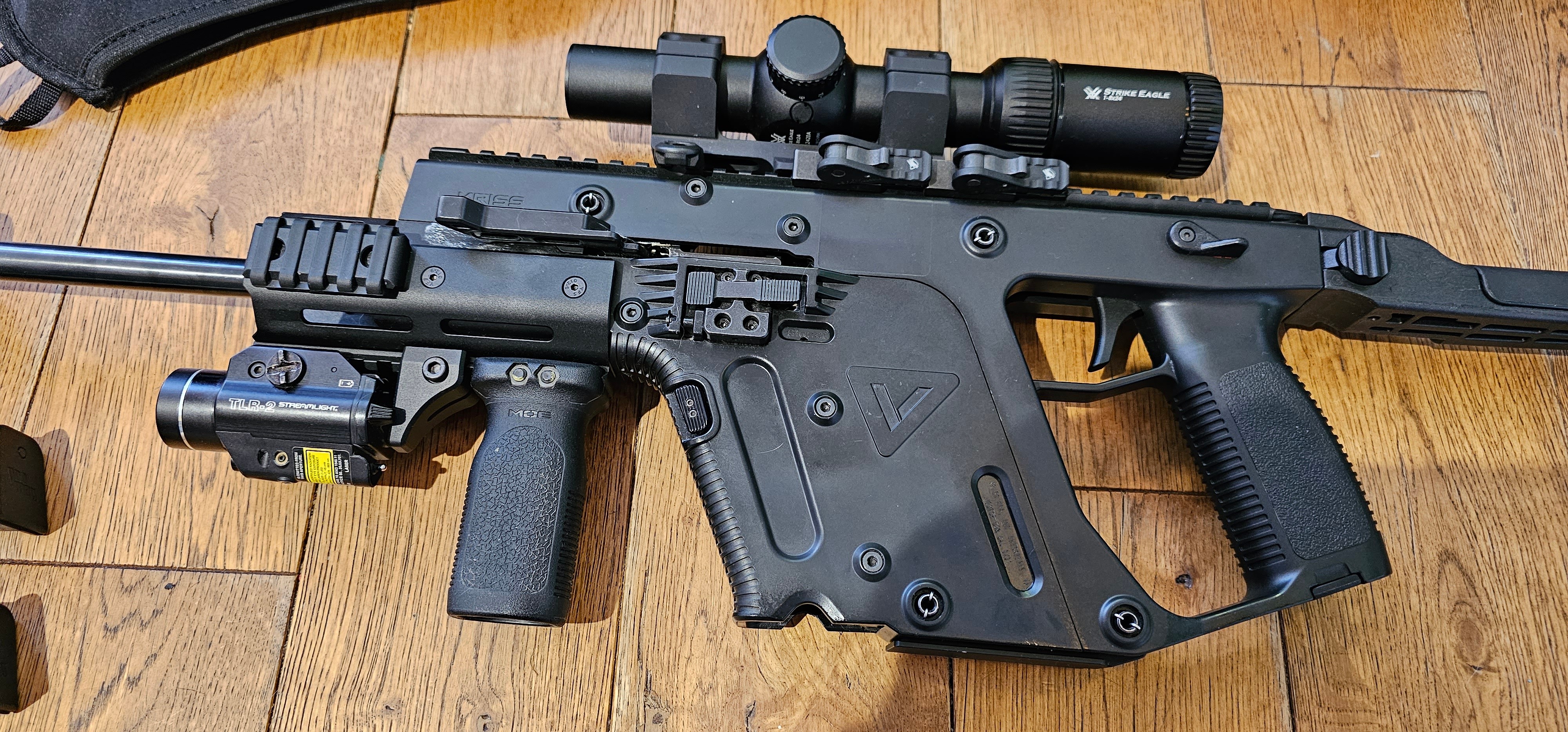 Продам свого карабіна. Kriss Vector CRB 9×21 Саундмодератор Zero Integral відомого майстра. Куча набоїв. Настріл 200 шт. Через ібіс був замовлений затвор від ген 2 бо з рідним дуло гільзи на заводському дозвуковому патроні. Це вписано в дозвіл. В наявності старий затвор щоб не було питань з приводу зносу чи великого настрілу. Карабін в ідеальному стані. На фото в смазці. Два роки не стріляв з нього. Всі інші плюшки на фото. На ціни на фото не реагуйте, зрозуміло що можна щось знайти дешевше. Карабін з саундмодератором 2000$ Оптика з кронштейном 800$ Інший обвіс окремо по домовленості Комплект 3200$ Входить : Сам Карабін Саундмодератор Zero Integral Оптика Vortex з прицезійною планкою Цівка Kriss Упор Kriss Ручка переносу вогню Magpul Ремінь трьохточковий з бистроз'ємом на карабіні Magpul Чохол на оптику Кейс Plano Tactical Складний приклад Ліхтарик з лазером Streamlight TLR 2 Аргументований торг Територіально в Києві зареєстровано в сумський обл. ....від себе: з дозвуком постріл не чути в сусідній кімнаті, точність актуальна 5см дозвук на 50-70м А з надзвуковими га 100м 5см. Це все завдяки довгому стволу та САУНДМОДЕРАТОРУ!