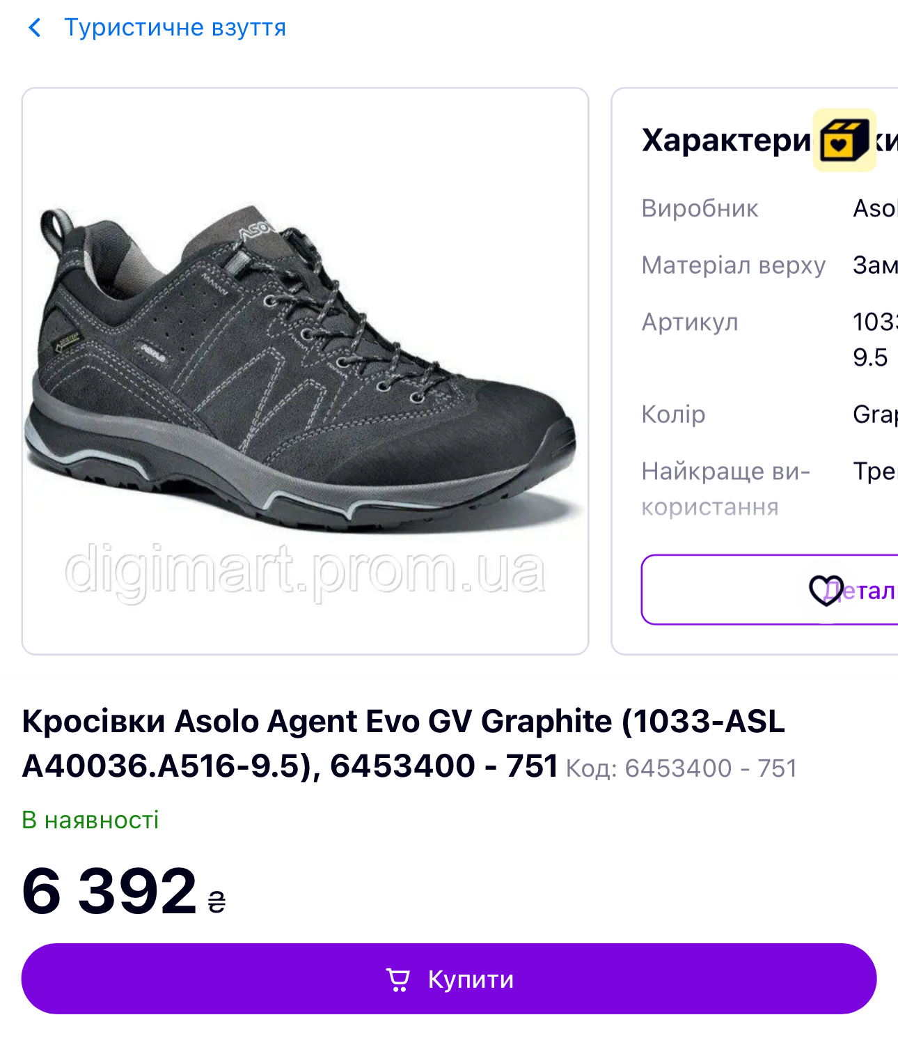 В ідеальному стані, без устілок. На довжину стопи 29 см Ціна 1500 Ландшафт, по якому ви подорожуєте, може бути непередбачуваним, а Asolo Agent Evo GV MM має ідеальний дизайн, що забезпечує зручну посадку і чіпку підошву, щоб забезпечити підтримку, захист і стійкість кожного вашого кроку. Черевик ідеально підходить для легких піших прогулянок і зимових прогулянок. Особливості: Розроблений як цілісний вологостійкий верх із замші товщиною 1,6-1,8 мм, що забезпечує довговічність і повітропроникність. Гумовий носок. Легка конструкція на шнурівці, яка дозволяє більш бажану посадку. Технологія взуття Gore-tex Extended Comfort забезпечує водонепроникний захист, завдяки чому ноги залишаються сухими і комфортно прохолодними. Цей неізольований захист найкраще підходить для помірного або теплого клімату. Устілка Lite 2+ пропонує легку підтримку і чудовий комфорт під ногами. Підошва з поліуретану забезпечує м'яку підтримку. Високотехнологічна гумова підошва Vibram EVA зі з'єднанням Megarip для чудового зчеплення. Матеріали і технології: Vibram - світовий лідер у виробництві підошв для альпіністського та трекінгового взуття. Підошва виготовляється з дуже міцної гуми, володіє відмінним зчепленням з поверхнею. Гарантує максимальну підтримку і міцність. Gore - tex - мембрана, що робить взуття водонепроникним, "дихаючим" і комфортним, вільно пропускає пар. Її пори приблизно в 700 разів більше молекули водяної пари, завдяки чому пар (потовиділення) може вільно виходити з взуття.