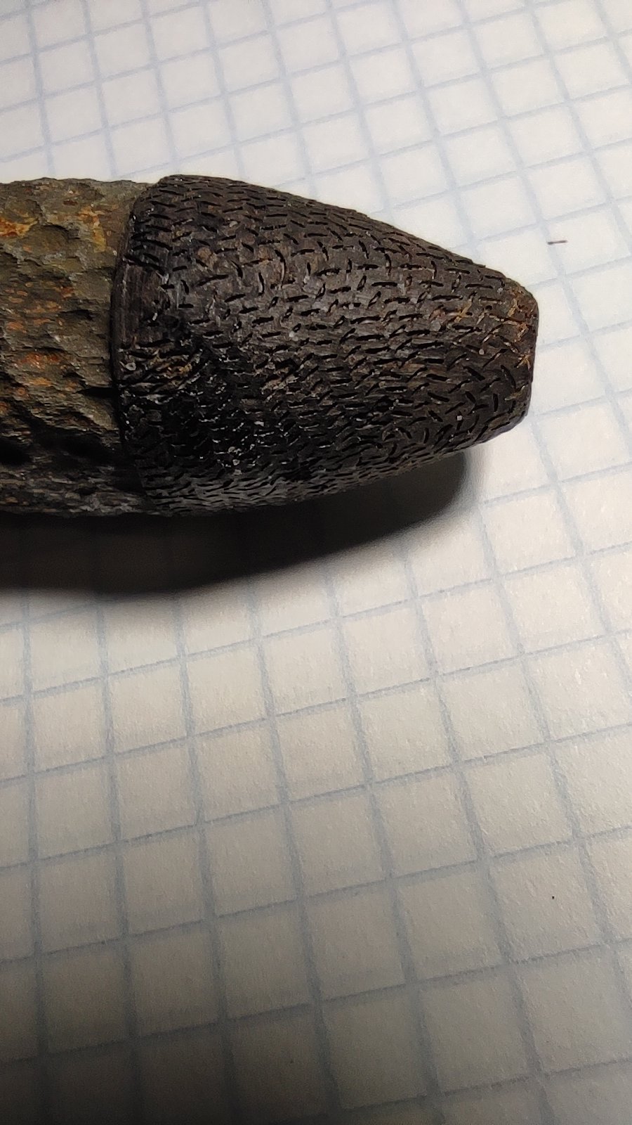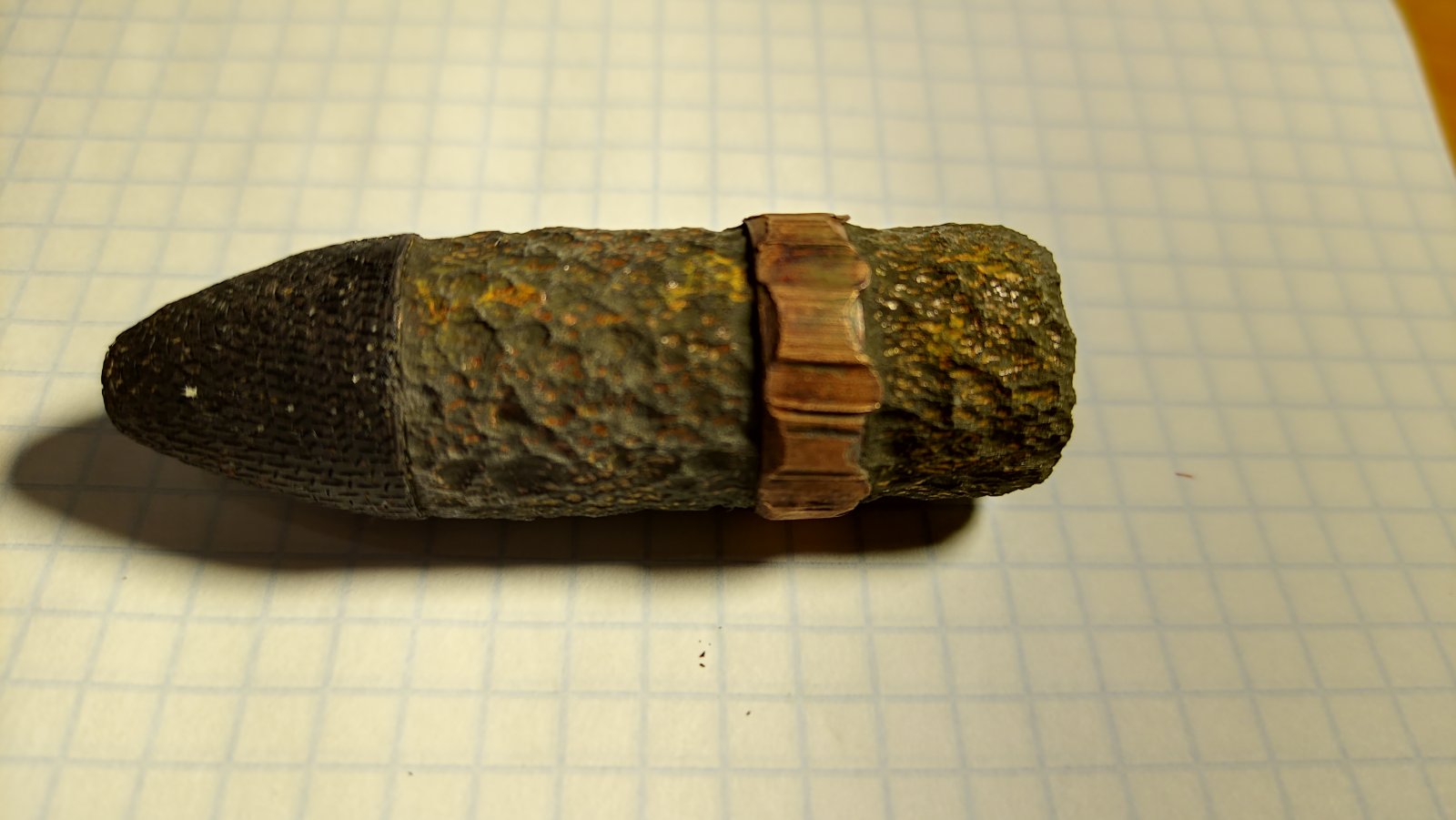 Согласно принятой классфиувйии - это СНАРЯД (т.к. более 14,5-мм). 20-мм бронебойно-зажигательный снаряд от выстрела 20х90R (один из вариантов - с бакелитовым колпаком с армирующей сеткой) . Авиационная пушка ШВАК и её танковый аналог ТШН-20. Ну так то безопасен. Но! Внутри снаряда зажигательная шашка, 2,8 грамма. Состав не важен, но в её состав ходит и тротил, пусть и мизер в процентах.